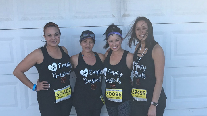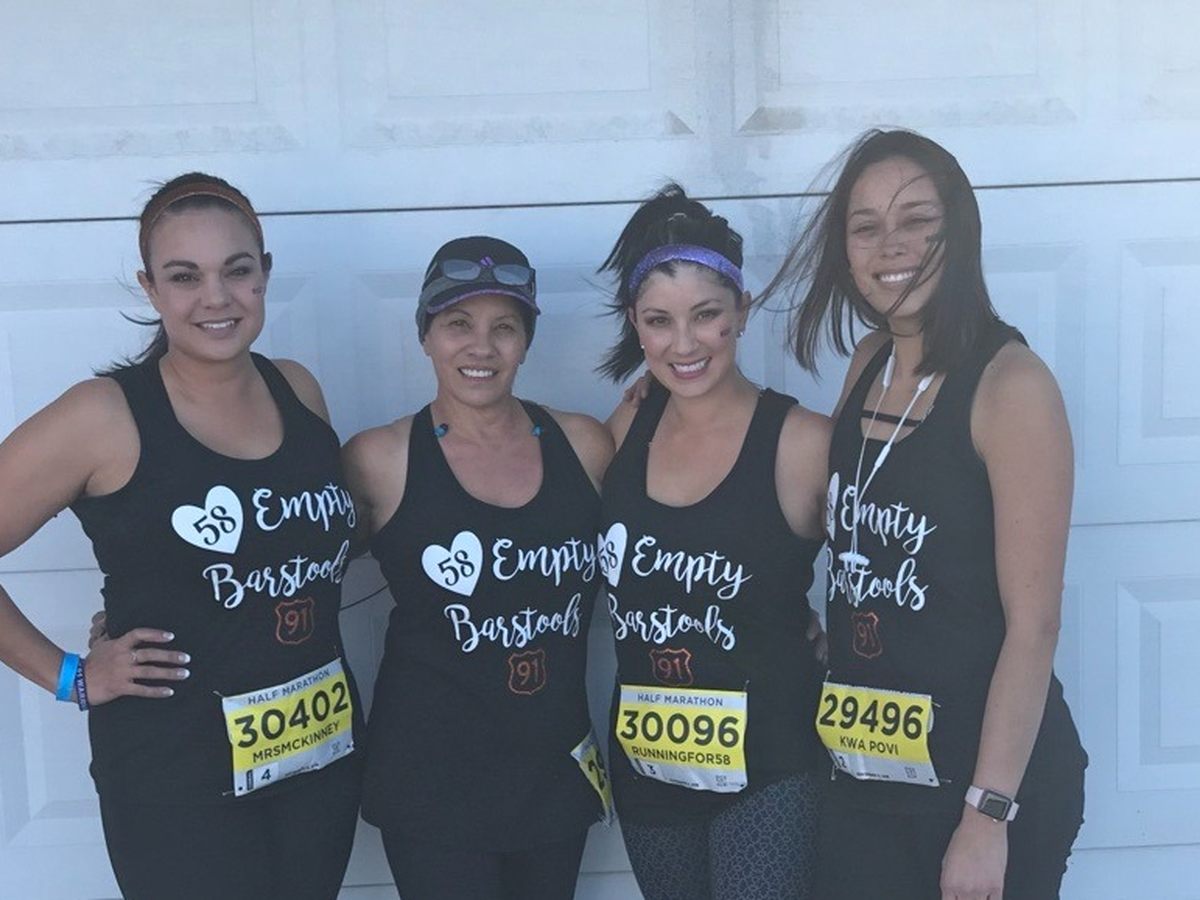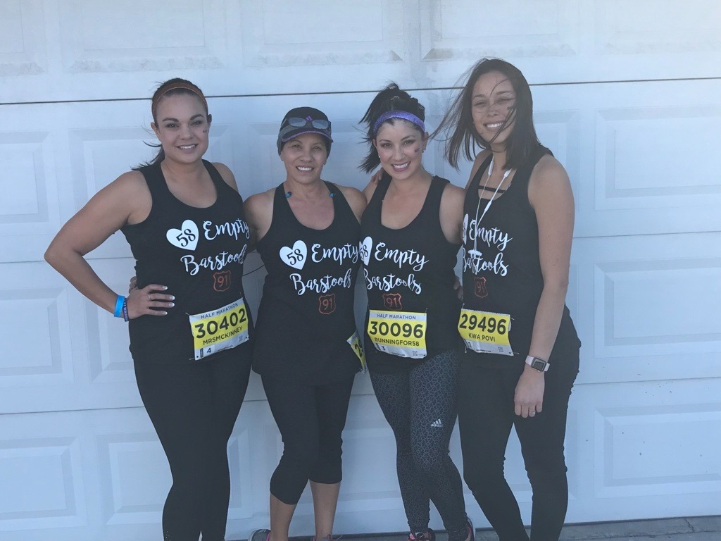 In 2017 Liz was in attendance of the Route 91 Music Festival in Las Vegas, the mass shooting in Las Vegas. It caused a lot of pain and heartache for Liz. In 2018 Tiffany, Liz’s mom Berna and her sister-in-law Leslie ran beside her in the Las Vegas Rock ’n’ Roll Half Marathon as she retraced the path of the October 1, 2017 weekend. In honor of the 58 victims, they all wore shirts that read “58 Empty Barstools.” (pictured).