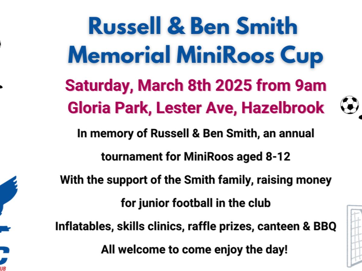 Hazelbrook FC wish to invite you to the inaugural Russell and Ben Smith Memorial MiniRoos Cup, to be held at Gloria Park in Hazelbrook on Saturday 15 March 2025*, from 9:00am.