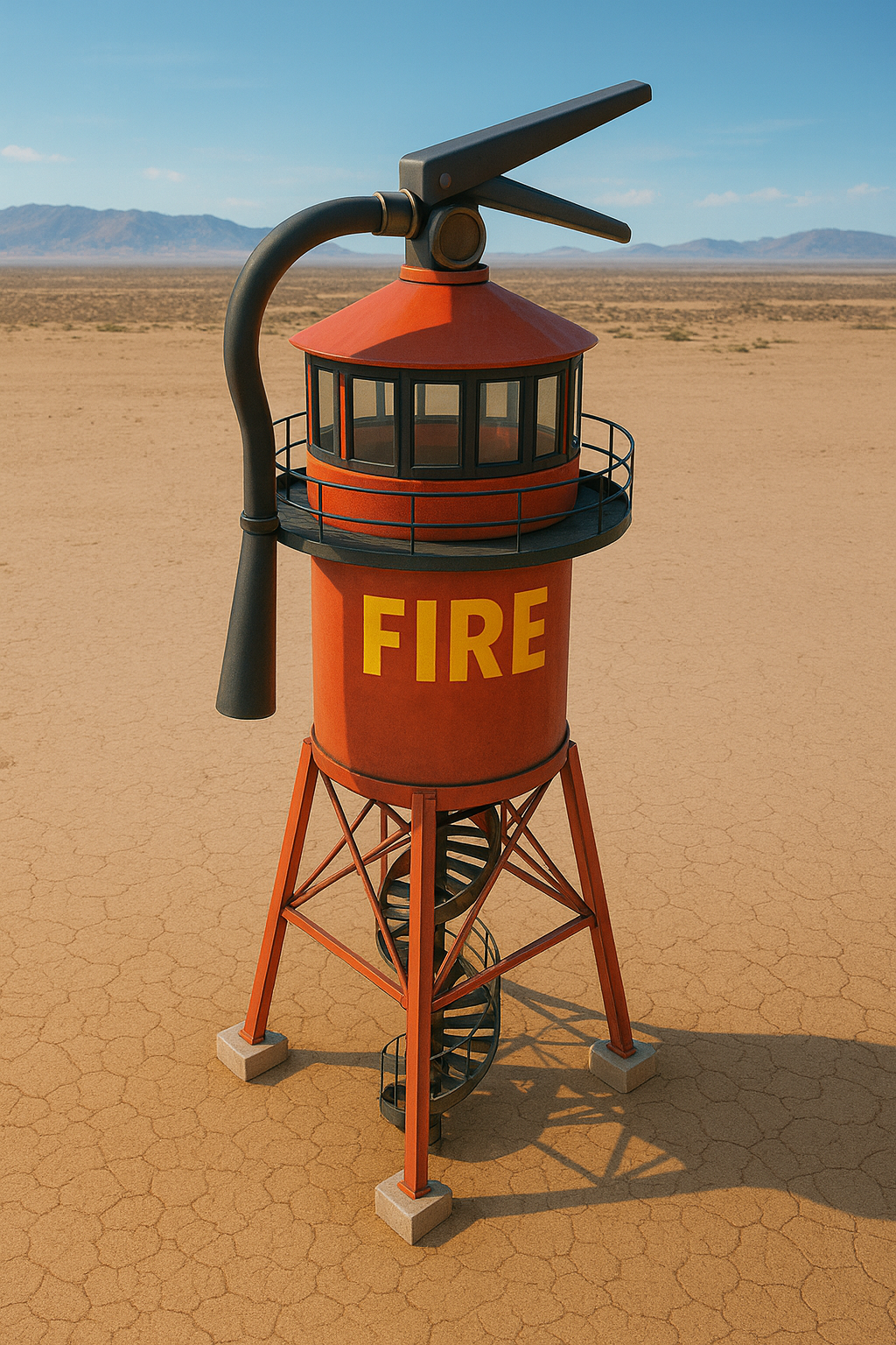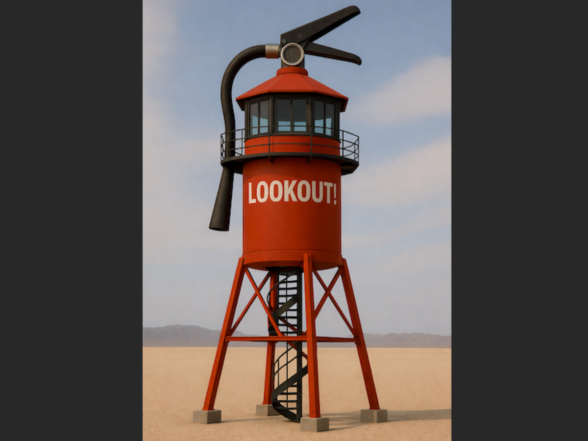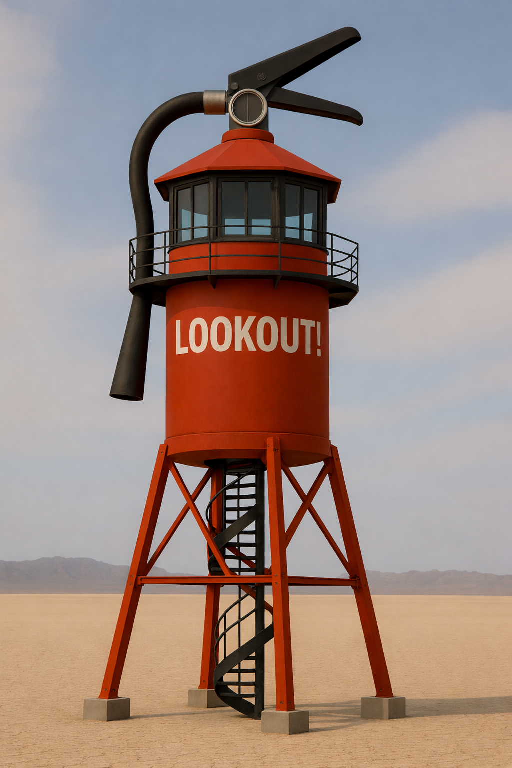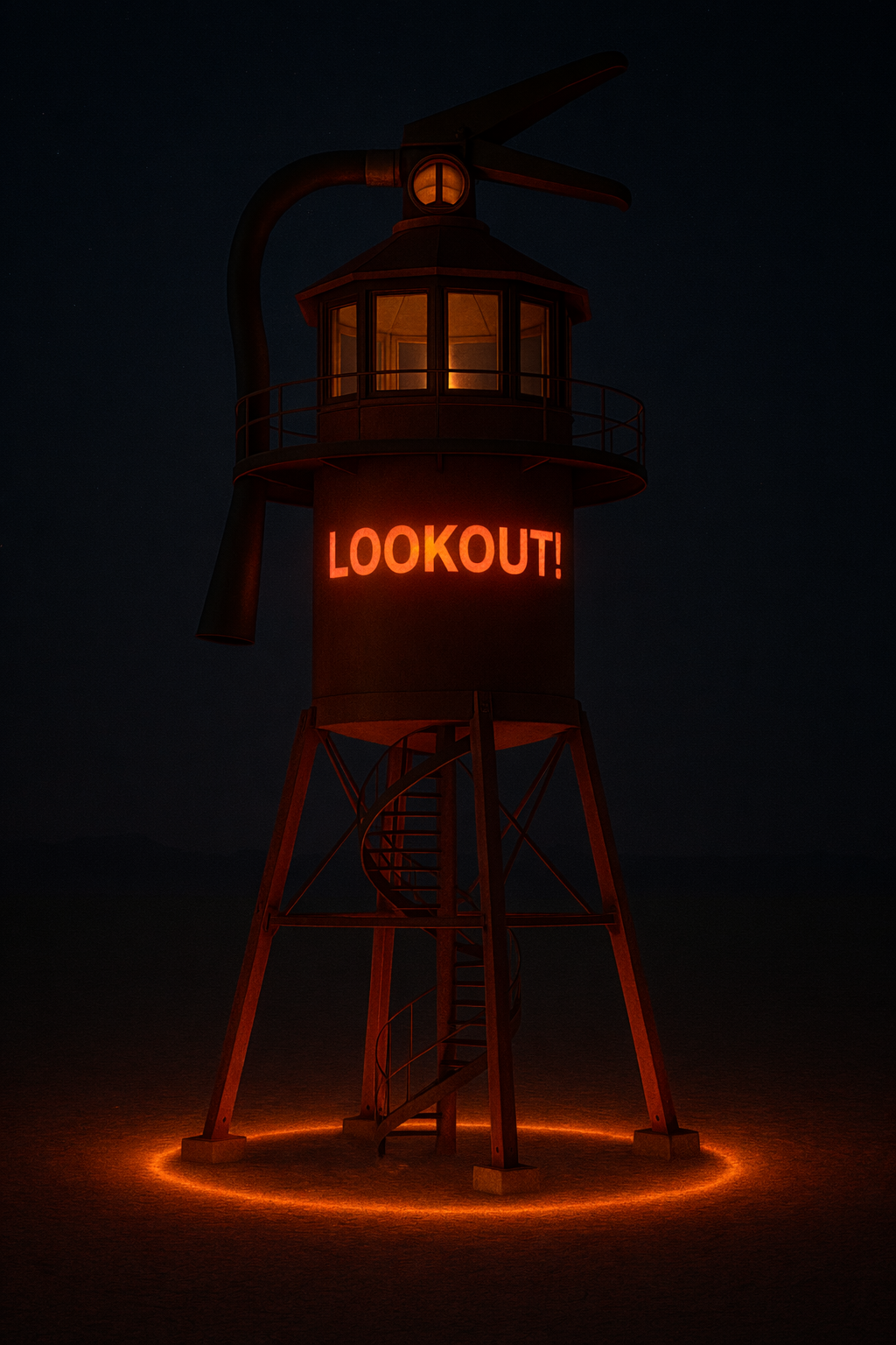 Lookout! is designed to invite both play and reflection, exploring the contradictory urges to light fires for celebration and to fight fires to protect ourselves and our communities from the dangers of the uncontrolled flames that threaten the world around us. By taking something mundane and making it larger than life, we hope to draw people in and invite them to reflect on the dichotomy of safely existing in a desert while aspects of the world burn around us. We believe we have a responsibility and duty to stay vigilant about our roles and relationships to all that we can see from atop our towers.
