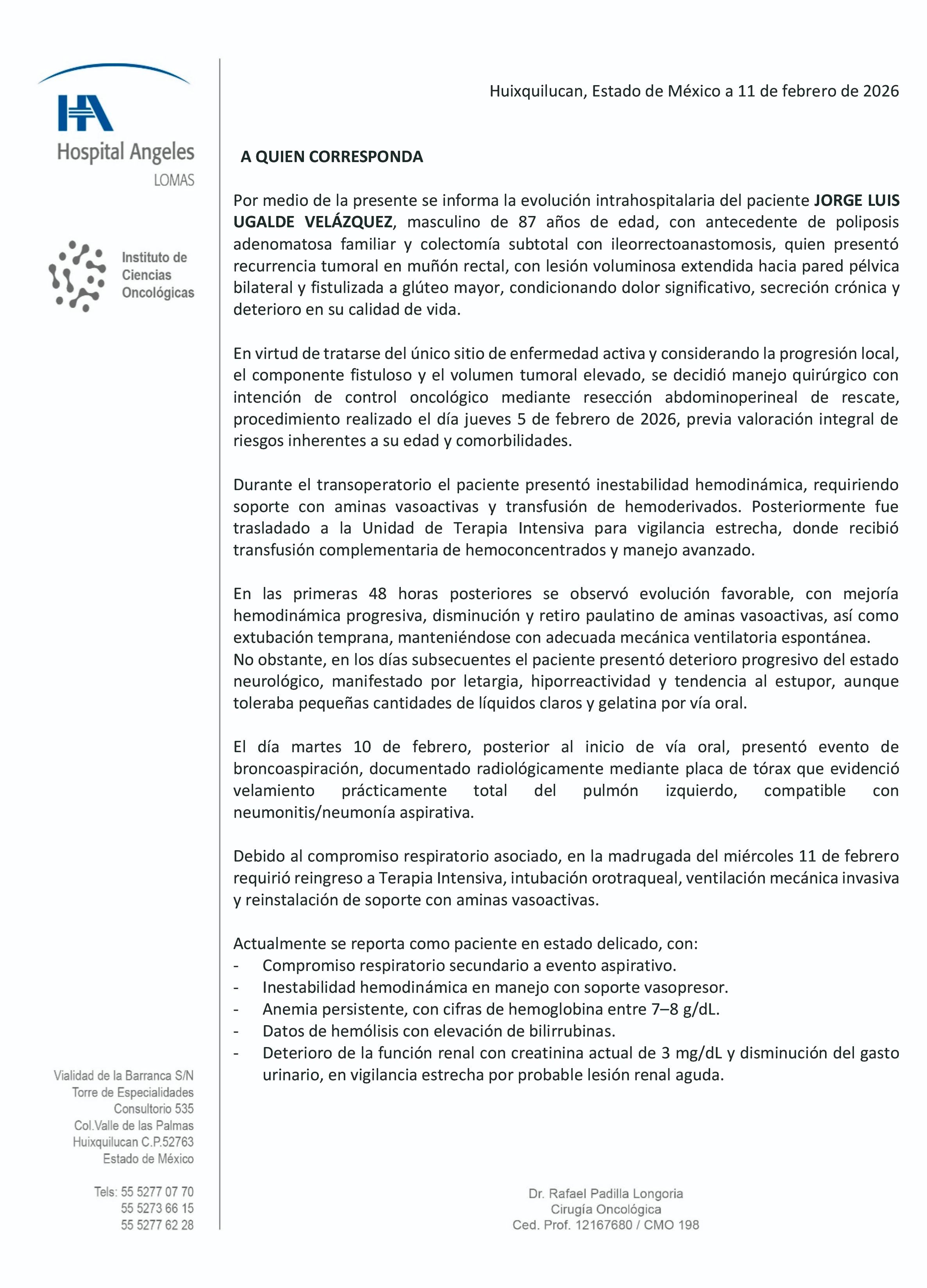 Este informe médico, emitido por el Dr. Padilla el 11 de febrero de 2026, confirma que cada minuto y cada recurso en Terapia Intensiva son vitales para sostener la vida de mi tío.