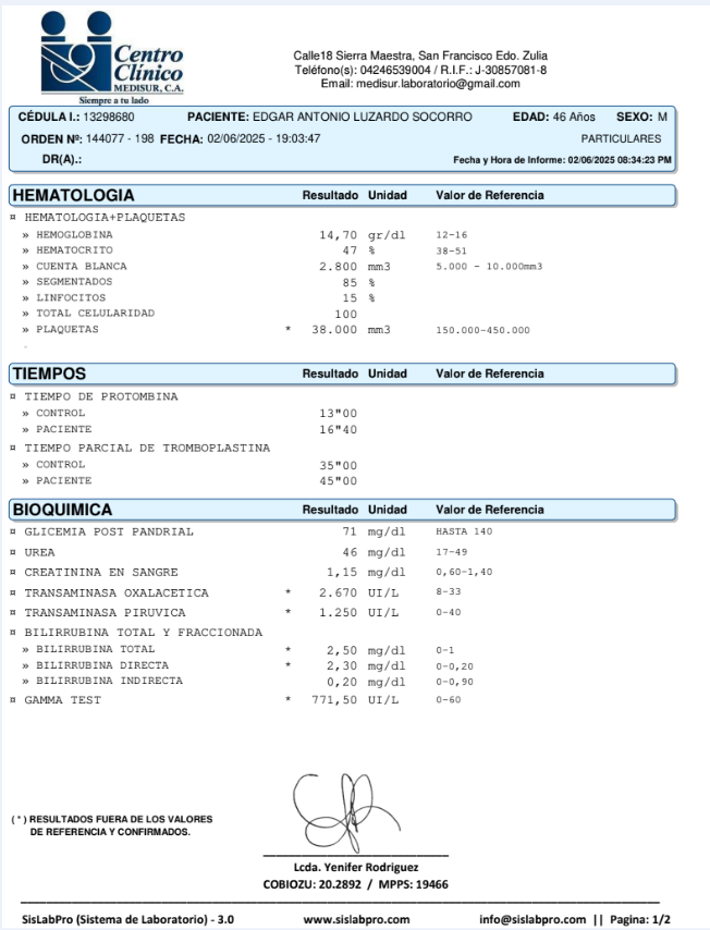 Por su cuadro clínico la recomendación era buscar UCI con electro schok, se consiguió UCI en la Clínica Sagrada Familia, desde entonces esta ali, Necesita mínimo 12 transfusiones de sangre, el hígado y el páncreas están muy afectados, hoy comenzó el tratamiento con plasma.. actualmente ES IMPOSIBLE SU TRASLADO a otro sitio donde quizás paguemos menos, seria un ALTO RIESGO PARA SU VIDA. Aun hay esperanza para el, es un hombre fuerte y saludable, los Doctores también tienen esa misma esperanza y confiando en DIOS, el único que puede levantarlo. Ayudemos a mi hermano a salir de esta por favor. GRACIAS de antemano a todas las personas por su granito de arena, que Dios les multiplique lo que hacen hoy por mi hermano.
