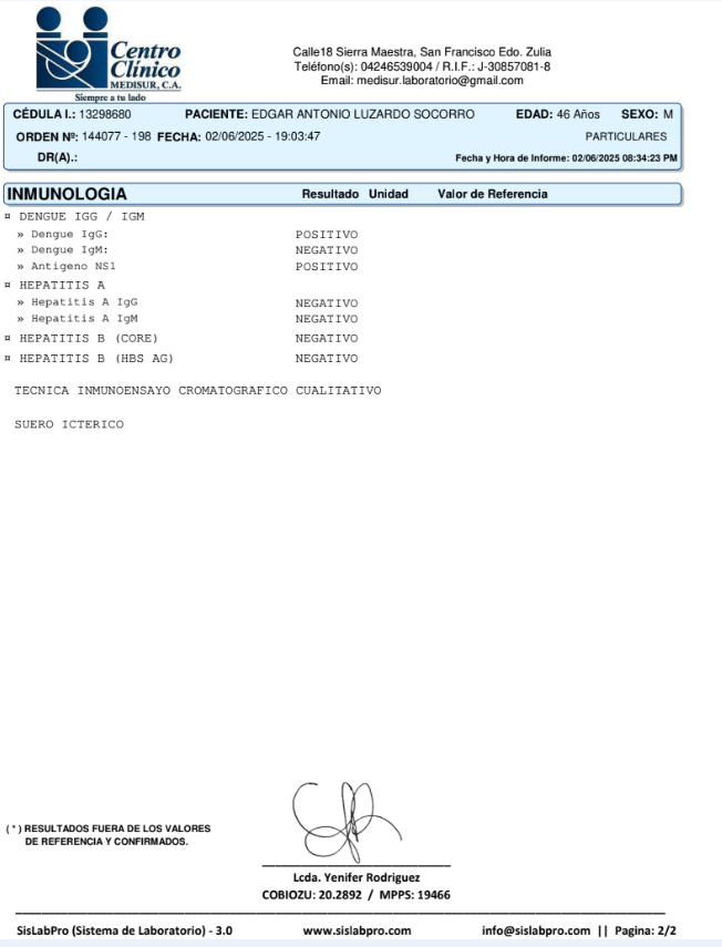 La semana pasada Antonio se empezó a sentir mal con vómitos y fiebre, se hizo unos exámenes que indicaban que tenia una infección y hepatitis.. comenzó su tratamiento pero vomitaba todos los antibióticos y comenzaba debilitarse por la desidratacion.. los aceptaba lentamente, es el lunes cuando ya no aguanta mas y va al hospital, donde le mandan a hacer exámenes de dengue, y da positivo para el DENGUE HEMORRAGICO SEVERO.