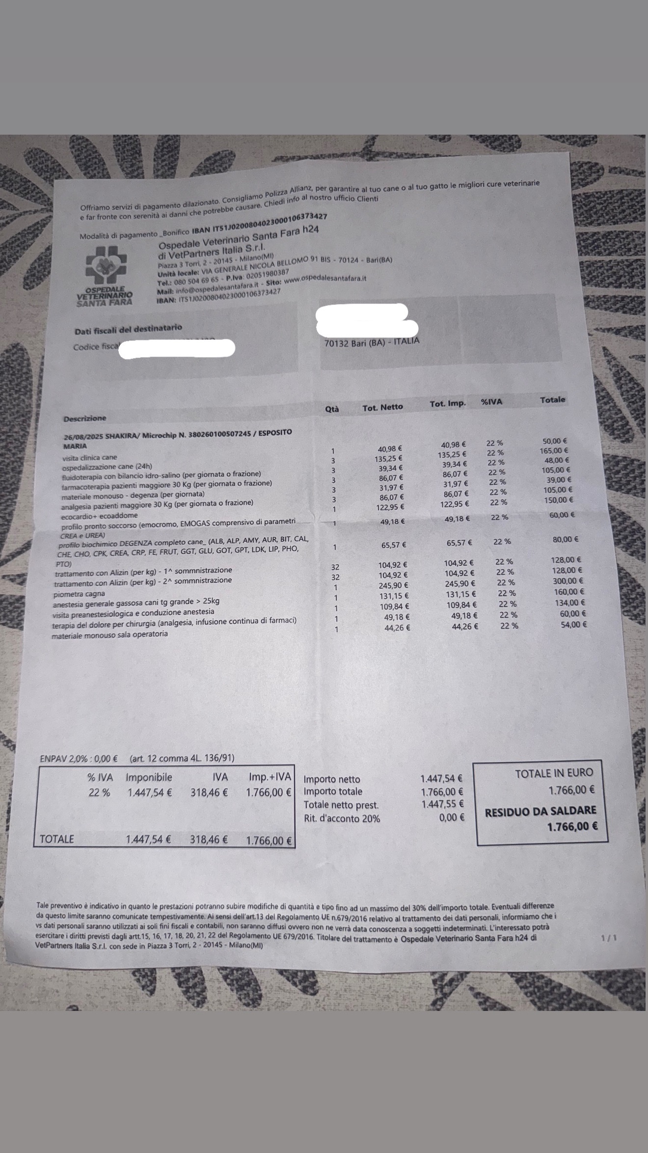 IBAN OSPEDALE VETERINARIO SANTA FARA: