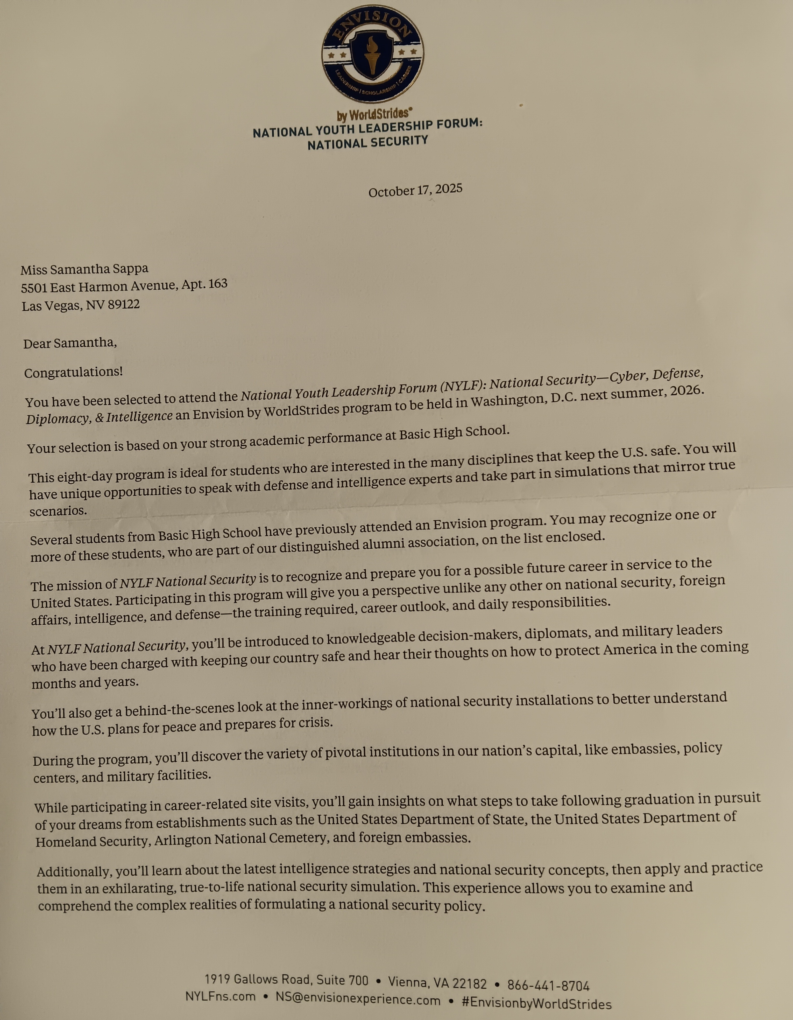 I have been selected and invited to attend next year's National Youth Leadership Forum: National Security for Cyber, Defense, Diplomacy & Intelligence in Washington, DC during the summer and I need all the help I can get. With inflation and the high cost of living, I want to help my parents in my own way to monetize this important "once in a lifetime experience" for me. Although with both parents working, it is still not enough to monetize my trip. The fee to attend is well over 4k and I will need one of my parents as my chaperone, so they will have to take time off of work to accompany me. They are not included in the 4k fee according to the admissions representative, so this is for my fee and my chaperone's 9-day stay accommodations (airfares, hotel, car rental, food, etc.). You will find my invitation and letter of acceptance in the photos attached so you'll know my goal and words are true.