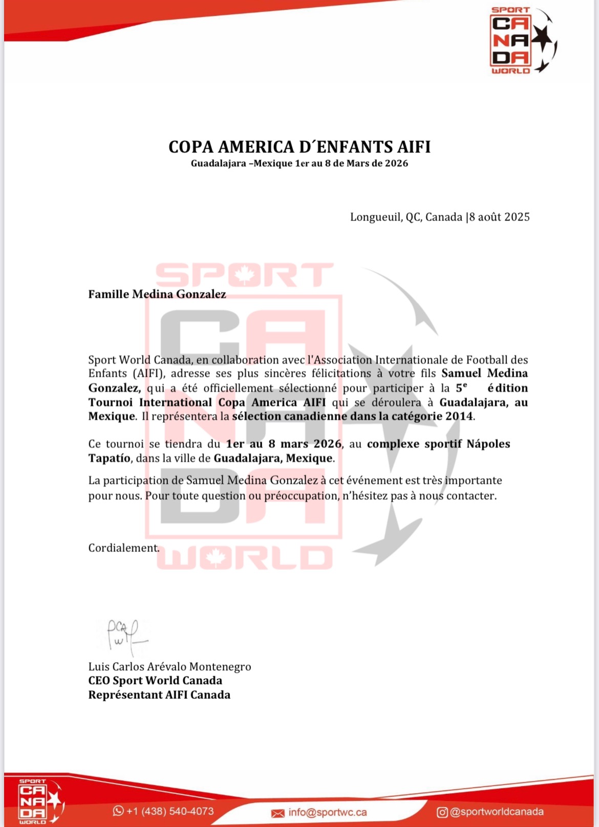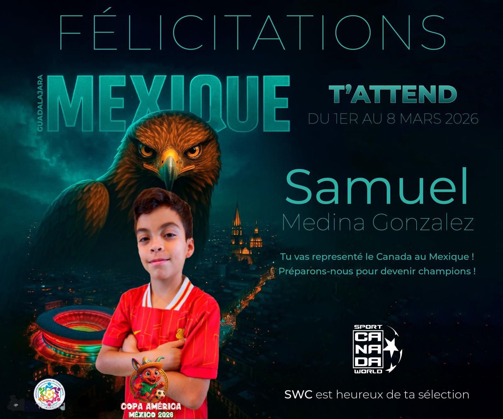 *********************************Samuel a été sélectionné pour représenter le Canada au tournoi international Coupe d’Amérique Infantile AIFI (Association internationale de football pour enfants) 2026, qui se tiendra du 01 au 08 mars 2026 à Guadalajara, Mexique.