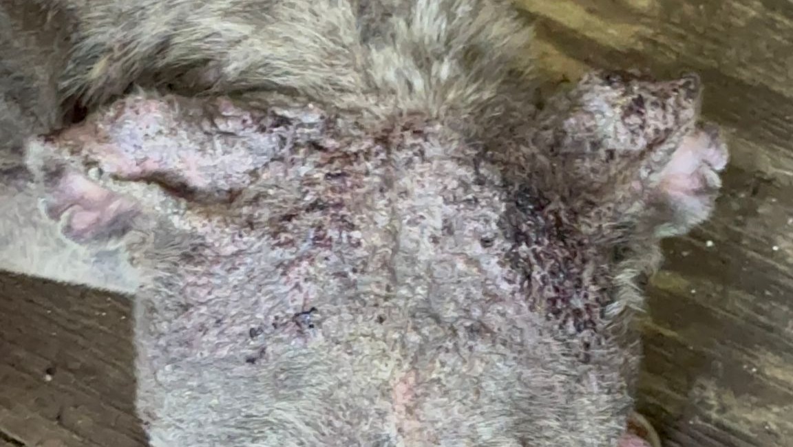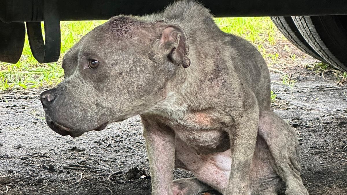 Her body is covered in scars, and she can barely stand on her own. When she walks, you can see she’s in pain. Her ears are torn, likely from dog fighting, her nails are overgrown, and her paws are badly burned. She is skin and bones.