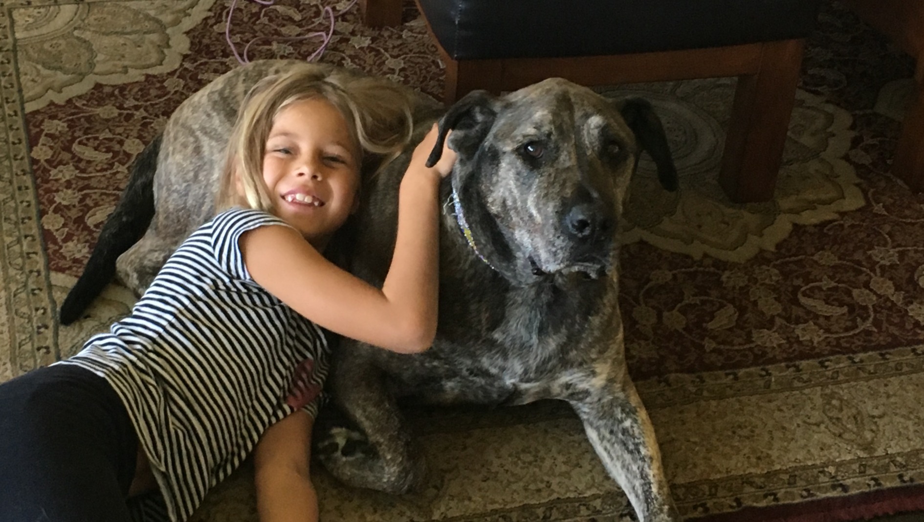 Marci snuggled with Phoenix who we adopted from Shepherd's Paws Animal Rescue. All of our dogs and cats get along.