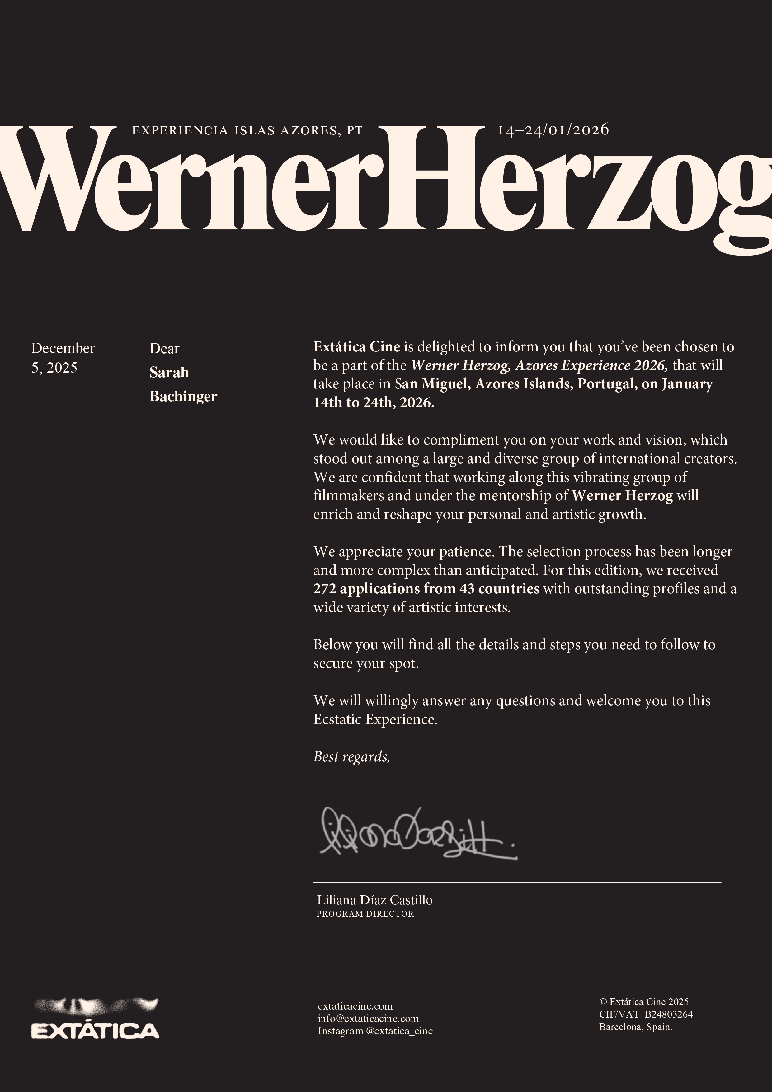 I am humbled, honored, and still a little bit stunned to share that I have been selected to participate in the 2025 Werner Herzog Filmmaking Experience—chosen from a pool of 272 applicants from 43 countries. To be one of only 50 filmmakers invited into this immersive mentorship is a profound privilege and a once-in-a-lifetime opportunity.