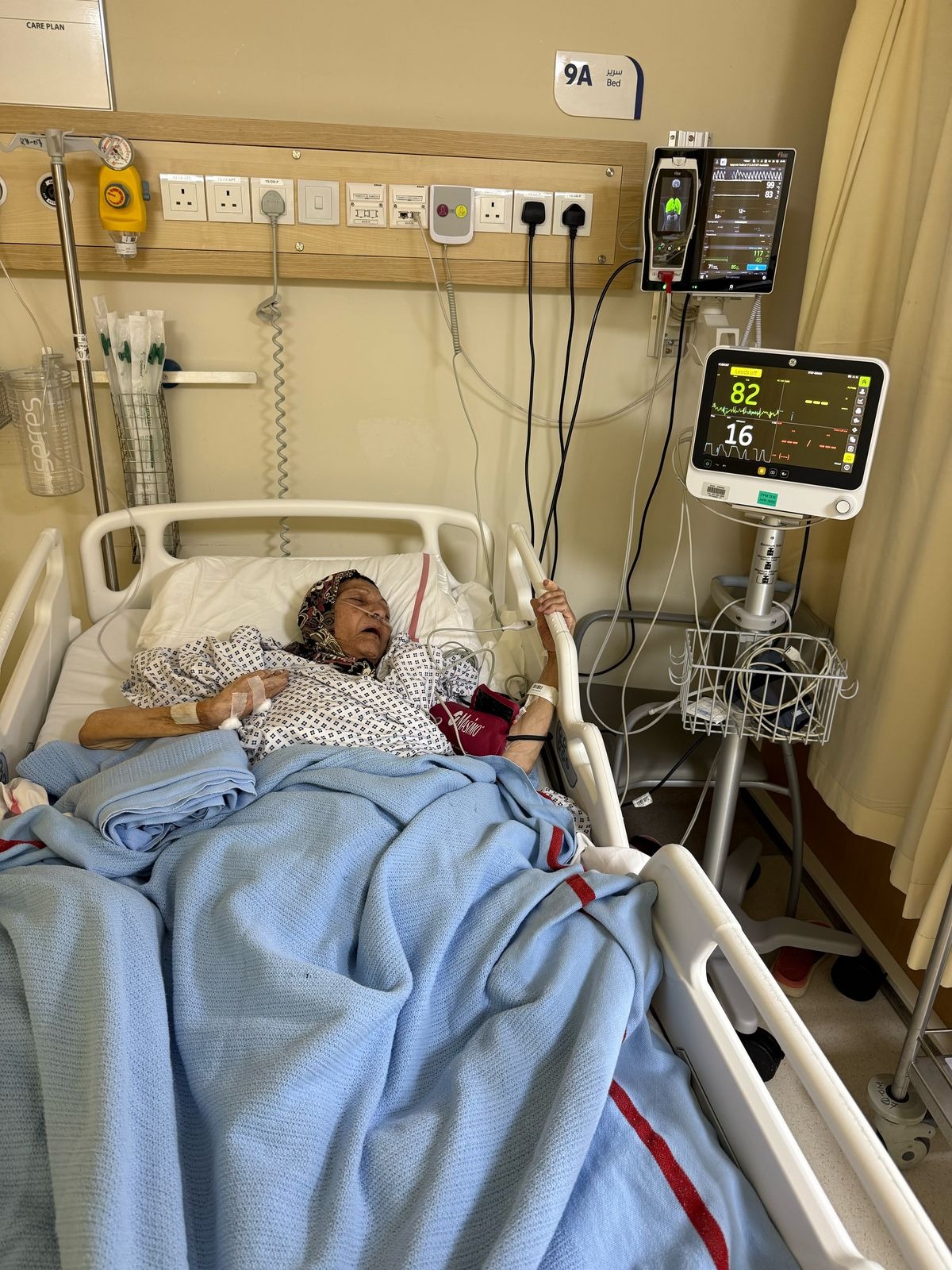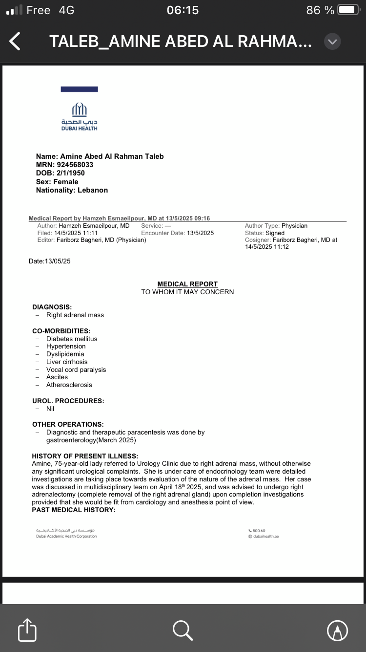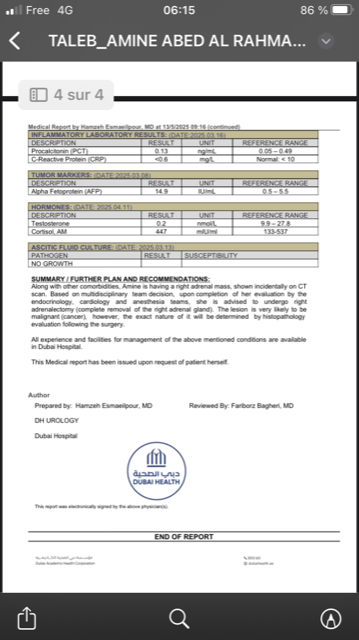 Le 5 mars 2025, Amina est arrivée à Dubaï pour rendre visite à Mustafa qui vient d’y trouver un travail. Déjà en mauvaise santé en raison de son âge et de la situation catastrophique au Liban, elle s’est effondrée en quelques jours. Son corps a gonflé à cause de plus de 23 litres de liquide accumulés (ascite). À l’hôpital, le verdict est tombé : cancer lymphatique malin, agressif et en pleine expansion (reins, aisselles, foie).
