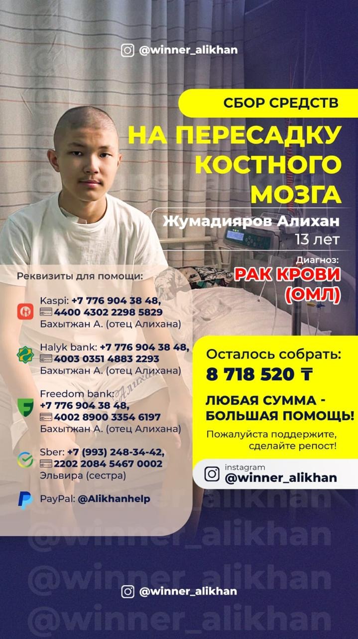 My name is Aliya, and I am organizing this fundraiser from Spain to support Alikhan, the 13-year-old son of my close friends in Kazakhstan, who is fighting for his life.