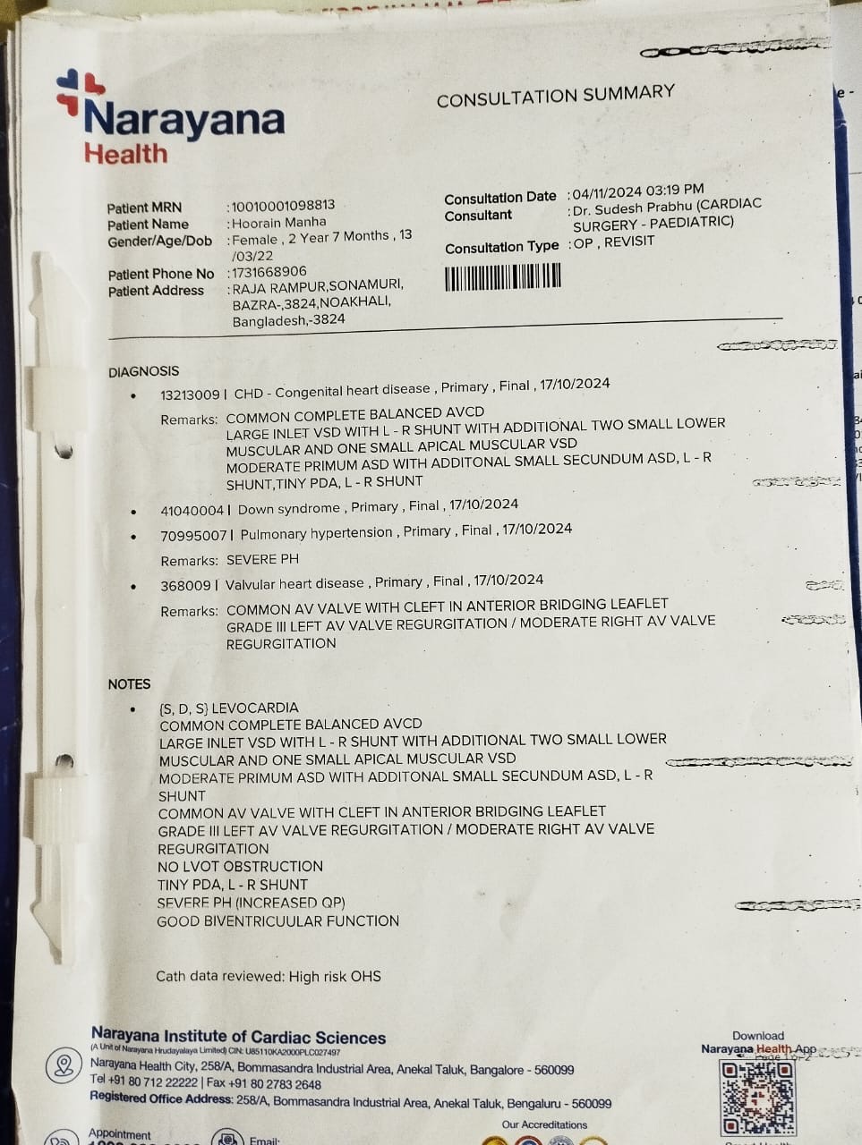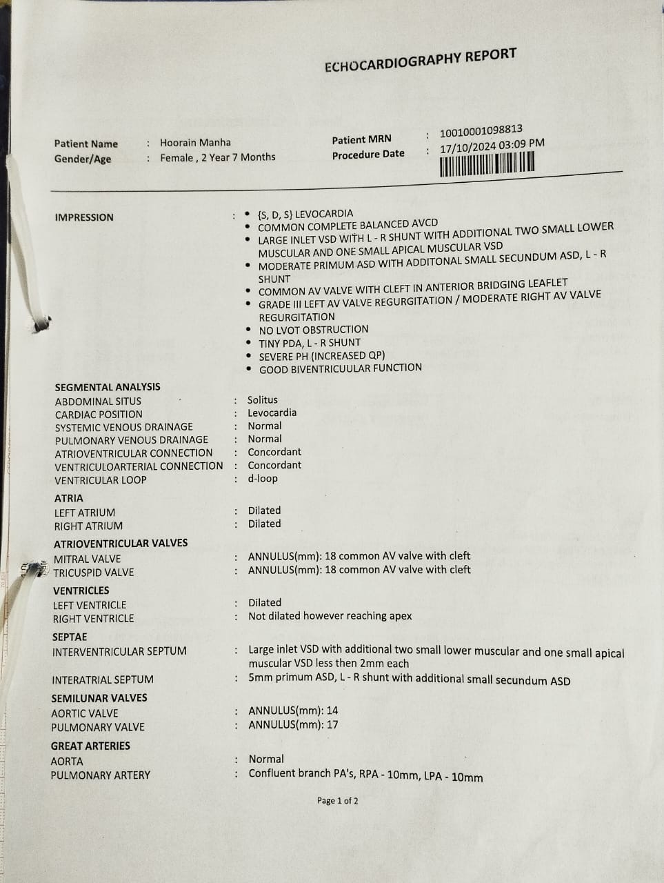 Hurain Manha is a courageous three-year-old child born with Down Syndrome and a complex congenital heart condition (Congenital Heart Disease (CHD), Large VSD, ASD, Pulmonary Hypertension & Valvular Heart Disease), Since birth, she has been in and out of hospitals, fighting a battle no child should ever have to face. Recently, she was taken to Narayana Institute of Cardiac Sciences in India, where she received initial treatment. However, due to the complexity of her condition, further specialized surgery is urgently required — one that can only be done in Thailand, where advanced pediatric cardiac care is available.