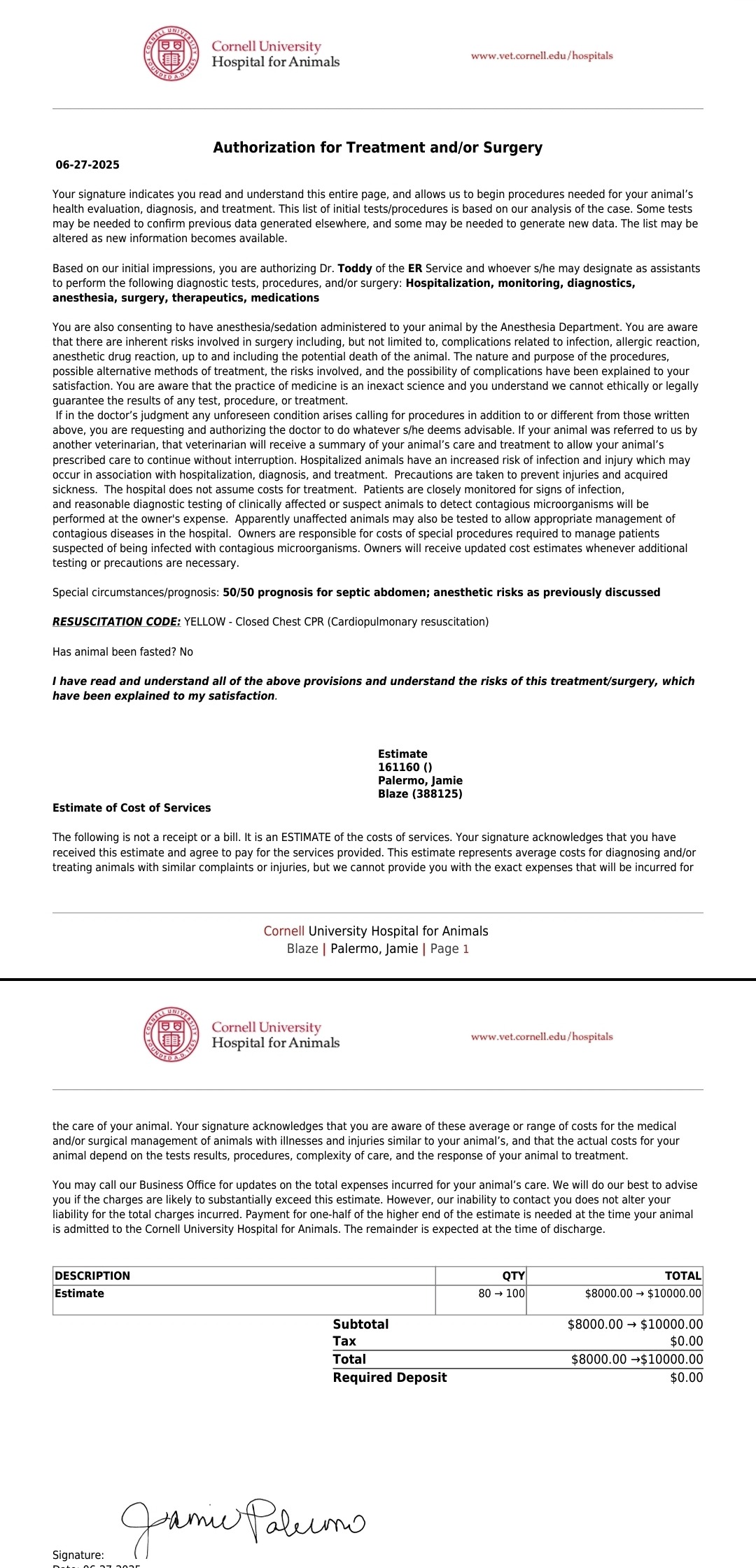 We rushed him to Cornell Animal Hospital, where we were told this was a life-or-death emergency. Surgery was estimated at $8,000–$10,000 with only a 50/50 chance of survival. Despite the cost, we chose to fight for Blaze’s life.
