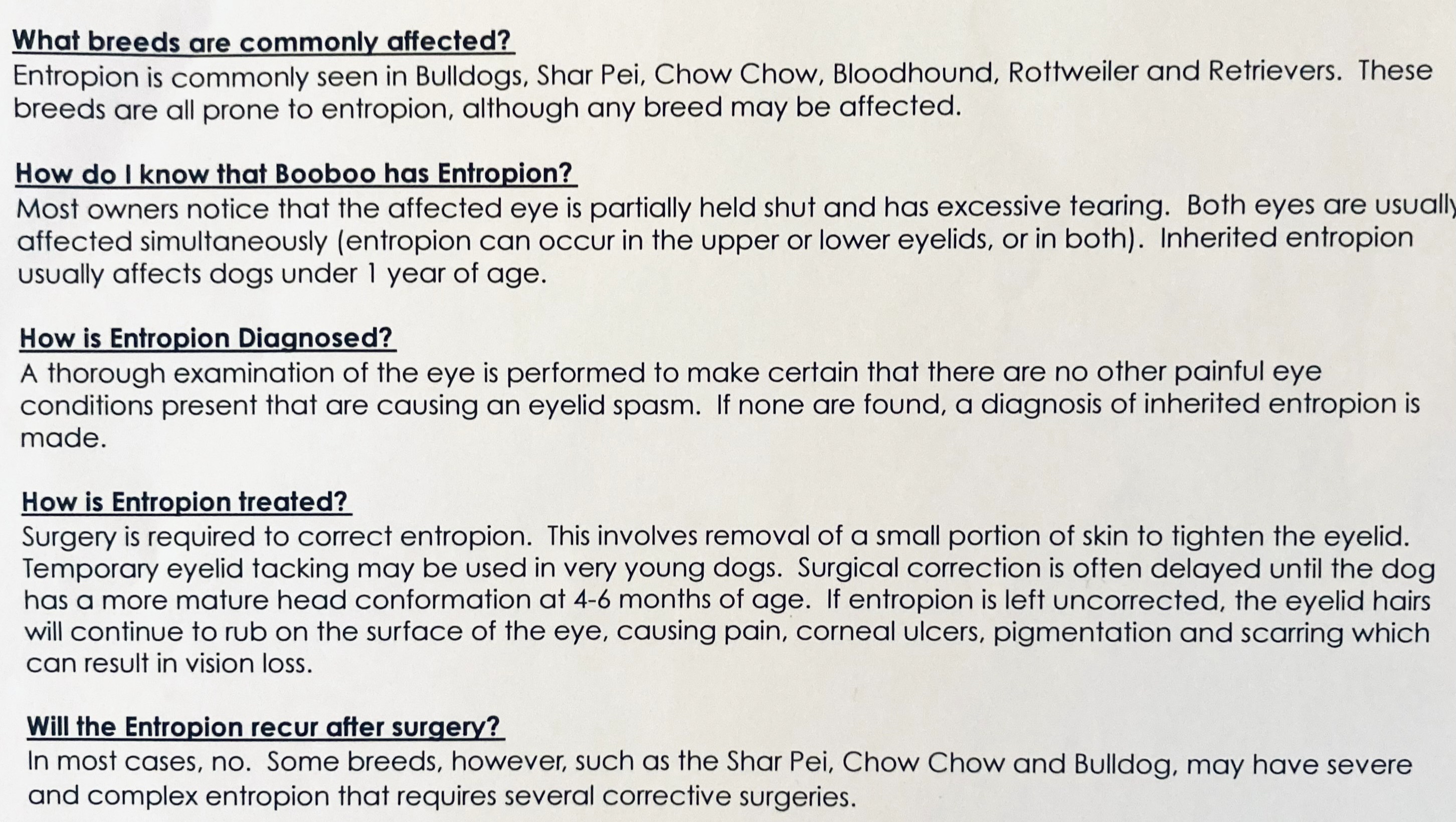 5 months ago our Veteranarian explained that BooBoo should have surgery before turning 1 years old in order to prevent many of the long term problems with this condition . He referred us to an Opthalmologist and consulted with a Specialist, all of whom recommended to book the surgery as soon as possible as they could see the amount of pain that she is in and state of her condition.