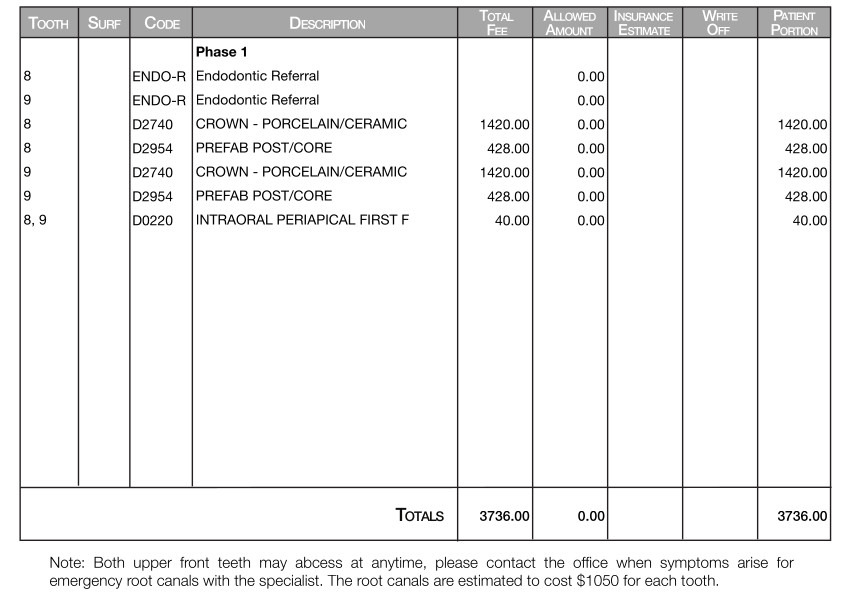 I have been told that if I do not get a root canal on each of my front teeth ($1050 x 2) that my teeth are at risk of abscessing and will need to be extracted. The cost of the new teeth themselves is $3,736, bringing the total to almost $6,000, or roughly half my yearly income at the moment. I am grateful to have been approved for $2,500 through the MusicCares foundation, which will help me out a ton, but still leaves quite a bit of the bill to foot. I've also been told that if I don't act quickly, that the work/teeth implants would amount to about $14,000, making this a particularly time sensitive procedure.