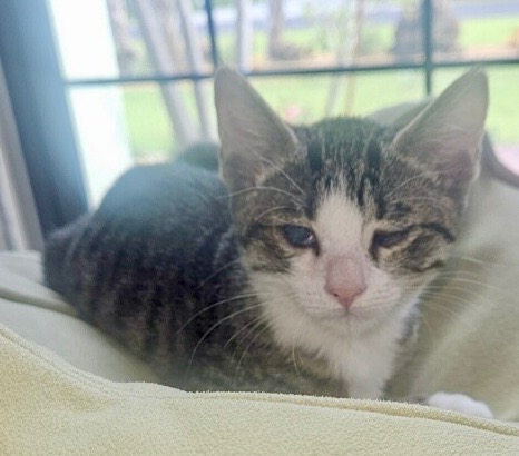 Little Dinky and her five siblings came to us as critically ill neonates. We pulled out all the stops to keep them alive: our incubator, nebulizer, subcutaneous fluids, numerous oral and ocular antibiotics, and we syringe-fed all six babies around the clock until they were strong enough to eat on their own. Their severe respiratory infections also infected their eyes and caused corneal lesions. Dinky was most severely affected and may have ruptured eyes. She needs to be examined by a board-certified ophthalmologist to determine if she will need a double or single enucleation. Please consider donating so we can get her the critical care she needs to potentially preserve her vision.