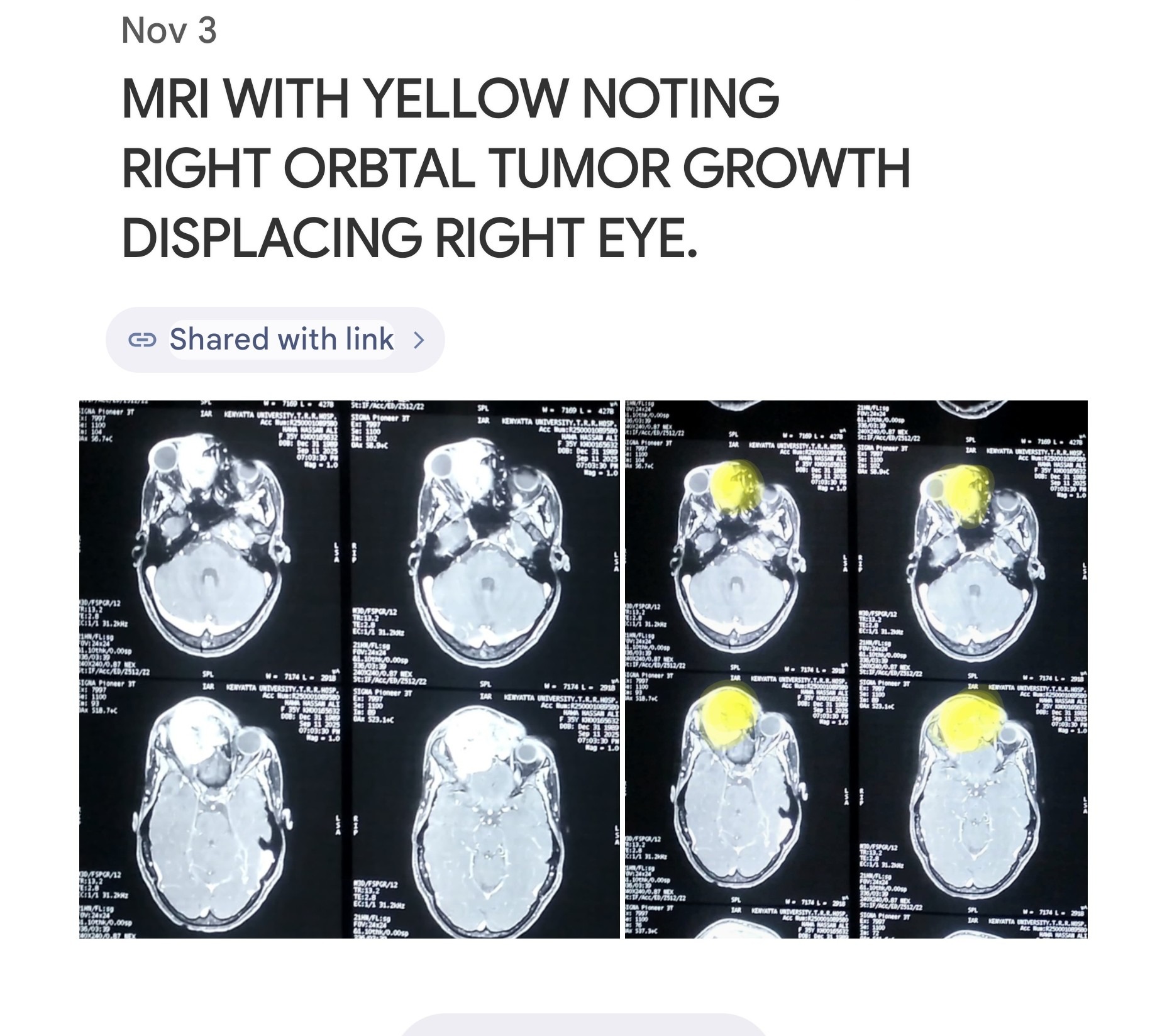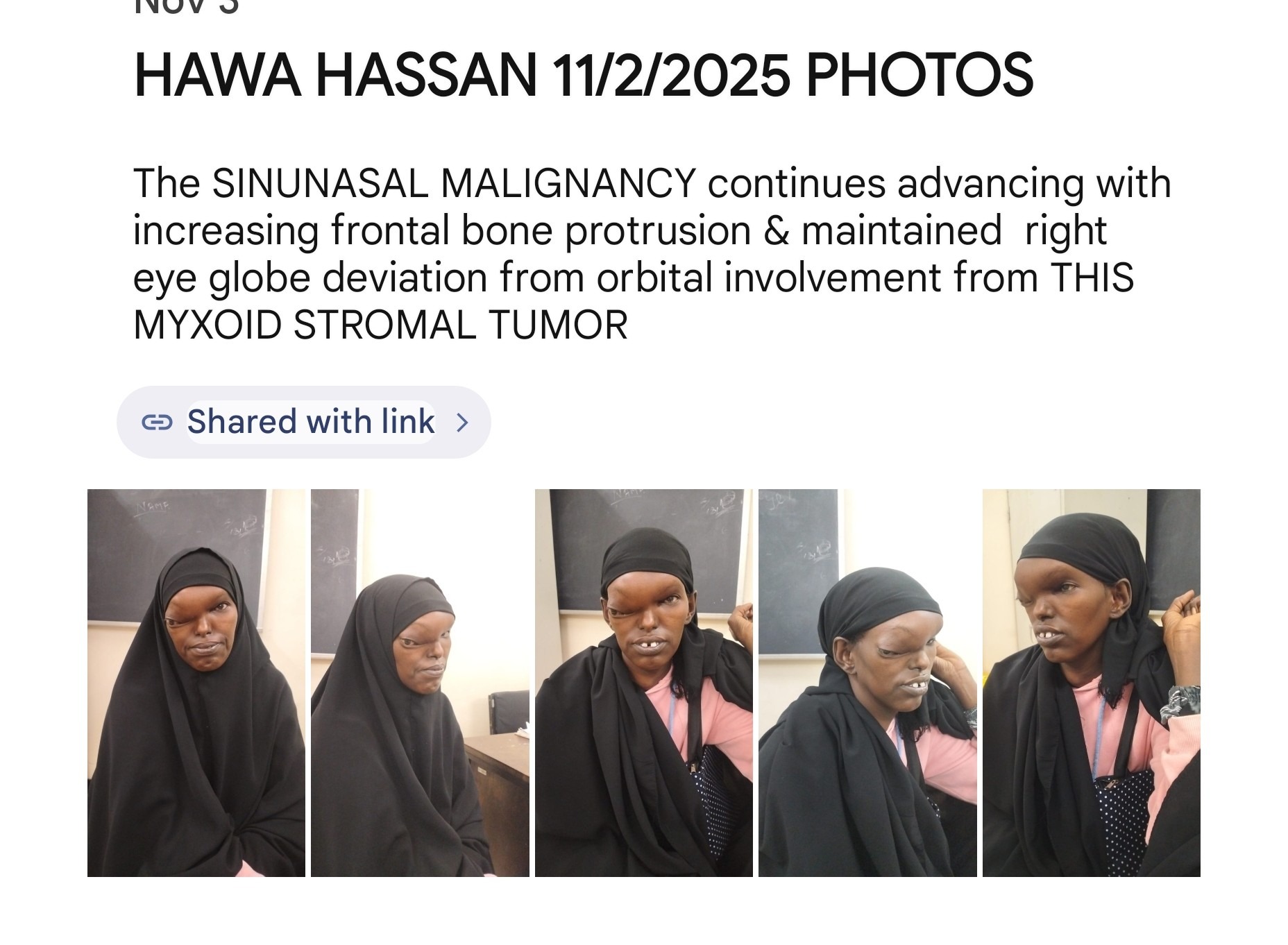 My name is Dr. Estrella M.R. Martinez, and I need the help of many to save the life of a special Kenyan woman, HAWA, age 35, and beloved mother of 5. Recently diagnosed with an aggressive sinus malignant tumor, which, as seen in photos and MRI/CT scans, has grown throughout her skull sinuses, invaded her right orbit, and frontal skull, resulting in great disfigurement and pain. The surgical and medical oncology plan is to first administer chemotherapy for several months, followed by surgical resection, and probable post-operative radiation. She will need massive reconstruction, with the hope being control of disease, and once therapy is completed, to return home to her village to be with her 5 beautiful little ones, who miss her terribly!