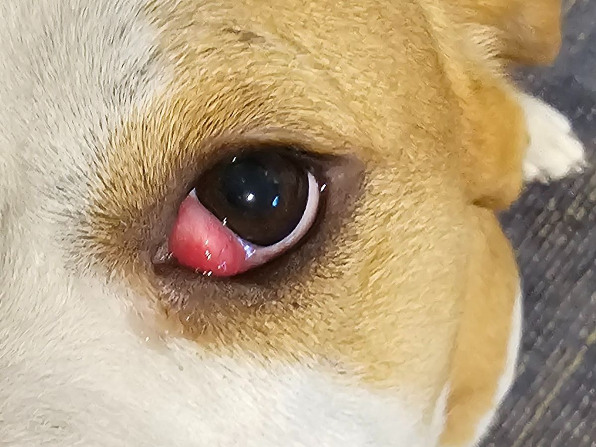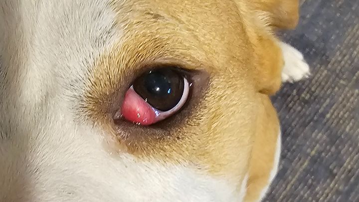What is shown in the photo is referred to as "cherry eye", third eyelid deformity that is common in beagles. If not operated on, she will eventually lose vision in that eye.