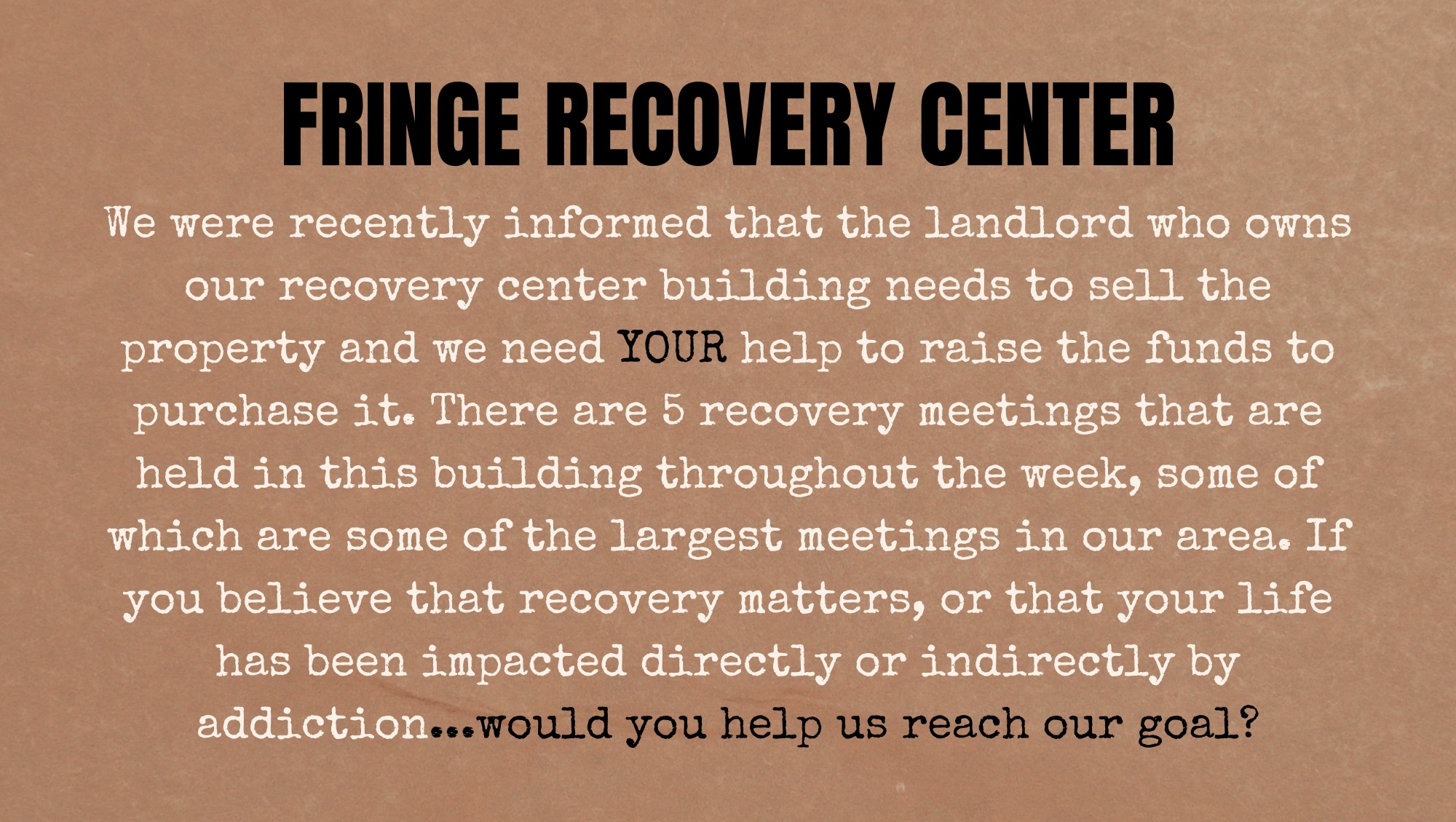 We were recently informed the landlord of our Recovery Center (32 N. 7th Street) needs to sell the building immediately. This space has been a refuge and beacon of hope for over 300 people attending recovery meetings throughout the week, and another 100 people for our Sunday morning gatherings.