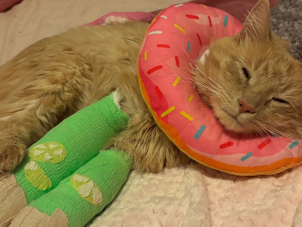He was fortunate enough not to have any internal bleeding or broken ribs, and. the vets say the breaks were in the best place they could be as far as being easy to heal. He still has a long road to recovery ahead and we could use any help we can get. Owen's going to need to get his bandages changed every 10-14 days over six weeks for just under $800 per visit, coming to about $2400. And that's not including the surgery he will most likely need on his back leg that has been estimated to cost around $6000-$8000, possibly more. He needs his different medications as many as three times a day as well as help eating, drinking, and going to the bathroom so he will need around the clock care. Even with these injuries, the vet is optimistic that Owen will make a full recovery and go on to led a normal life if he can complete his treatment plan! They said the way he's retained his appetite and is behaving as normal is an extremely good sign that he's on the right track. He's still acting like a normal, happy kitty!
