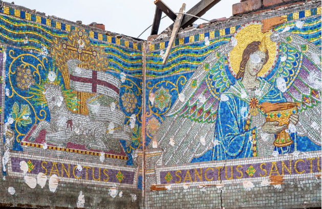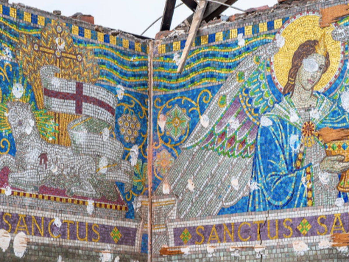 During demolition works at the former Islamic High School for Girls on High Lane, a breathtaking mosaic scheme—crafted from Venetian glass smalti, gold leaf, and Jesse Rust recycled glass—was revealed behind decades-old plasterboard. Dating back to around 1905, it’s believed to be part of the original Chorlton convent school, a vital part of the St. John’s RC Parish.