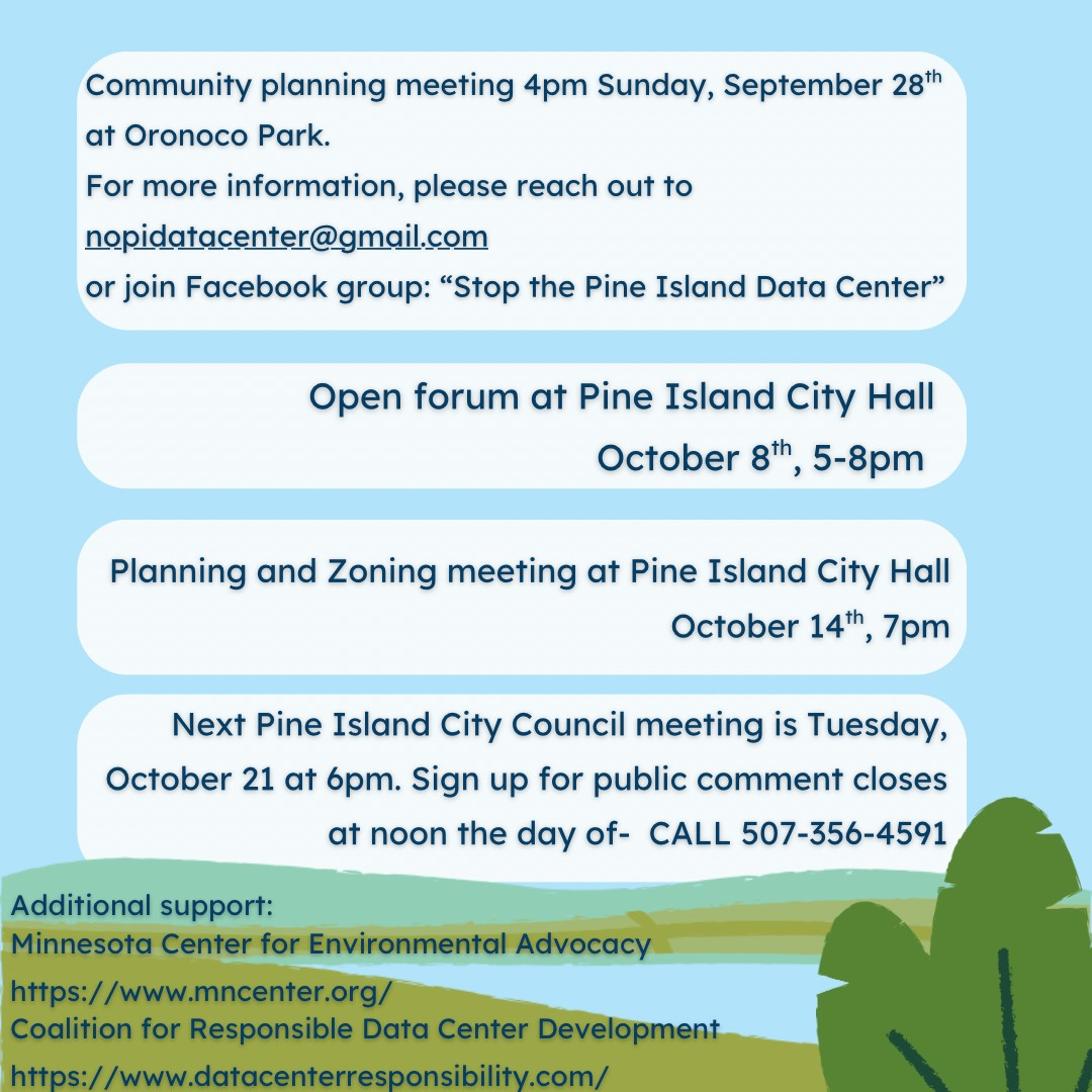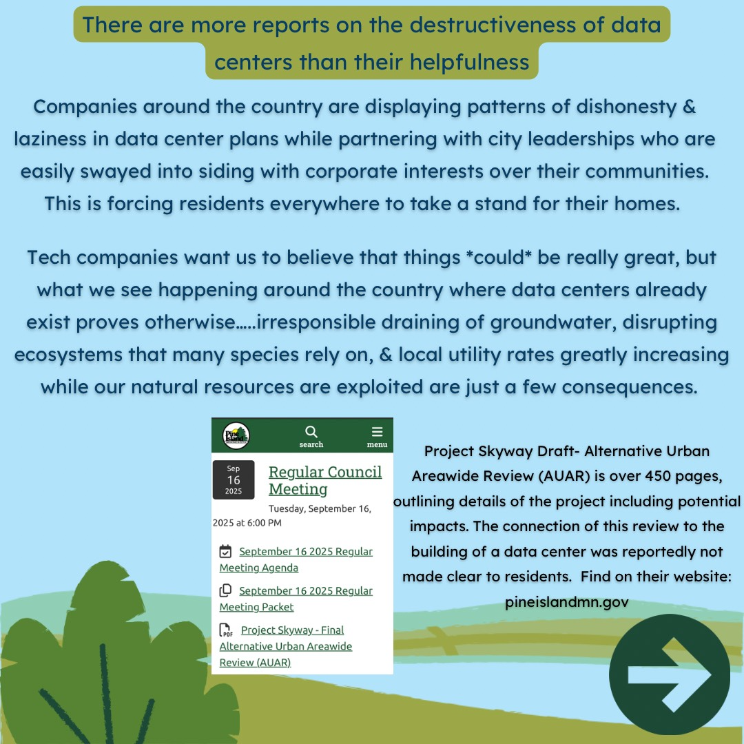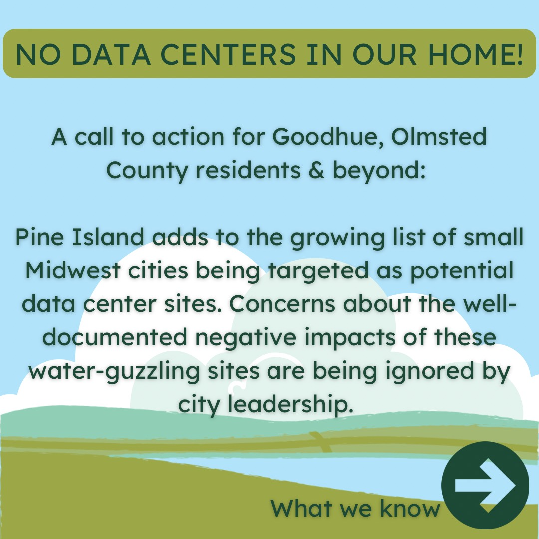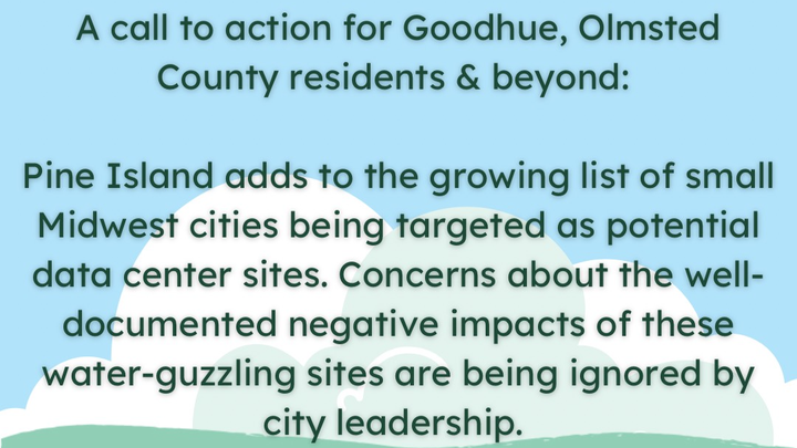Pine Island residents have only recently learned that one of the largest data center in Minnesota, “Project Skyway,” is being planned for our small town. This 482 acre proposal is twice the size of US Bank Stadium in a town of less than 4,000 people. Data center development across the board is being done in secrecy, with NDAs and only vague plans that use words like "technology center" instead of "data center" disclosed to the public.