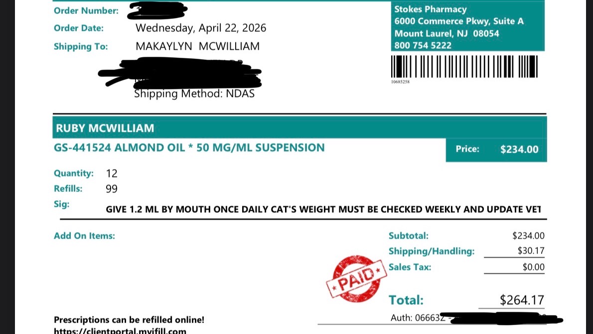 Hello, my name is Makaylyn McWilliams. I currently live in Pittsburgh. I have two kitties, Ruby and Scrim. Ruby recently got diagnosed with FIP, which is a fatal disease that cats can contract. I am not the type of person to ask for money or help, but my pet insurance is not covering the costs that are associated with this. As of right now for receipts and papers, I have the cost of the initial visit, that is paid for, and a 10 day supply of medication, that is also paid for. Ruby will unfortunately need 74 more days worth of medication which is roughly around 2 thousand dollars. My only other option is to put my kitty to sleep, and I will not do that: she is young (barely a year old) and a very lively, happy cat, despite having FIP. If I can get some help, it would be appreciated. Like I said, I do not ask for help often, but I’m in my first year as a graduate student for social work at the Uni of Pittsburgh. I have a job but it does not pay as well
