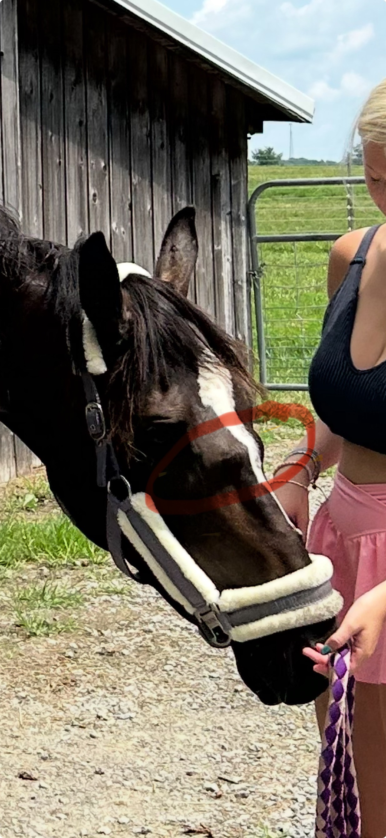She was clearly not being given proper nutrition. She had failed a PPE 4 weeks previously, she had diagnosed EPM which was not being treated , AND most alarmingly this bony structure on her nose was from a violent injury after being tied in a rope halter to a trailer in April! Sammy suffered significant injury and trauma at the hands of her previous owner who never even called the vet despite admitting she was bleeding from her nose and mouth after the incident. This growth has continued to get larger and obstruct her face since the injury on April 15th. We were blatantly lied to and deceived.