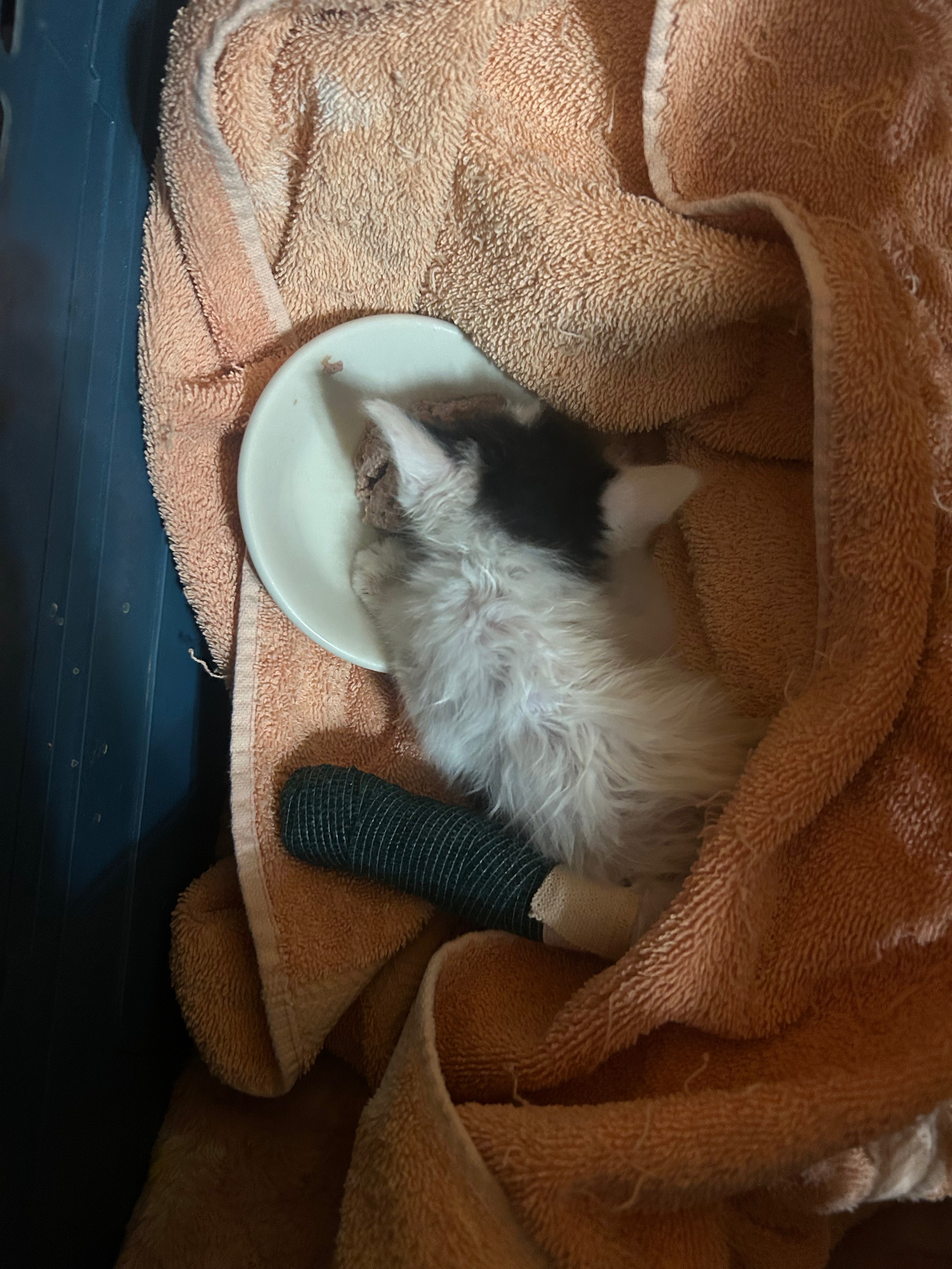 Steve was found at a cat colony in central Mesa, Arizona. This colony has been undergoing TNR since this Spring but unfortunately there are at least two more mother cats left to spay. Steve was found with a piece of twine twisted tightly around his left rear leg. The twine was removed and Steve placed on antibiotics. Fortunately my great vet, Dr. Cindy Junger at Alma School Animal Hospital was able to get us in the next day. Steve is undergoing amputation of his leg. Even though he’s very small (he’s only about 6 weeks old) and a bit anemic, he is at great risk of sepsis if the leg isn’t removed ASAP. If you can help with Steve’s costs, he and I would be very grateful! Thank you for reading.