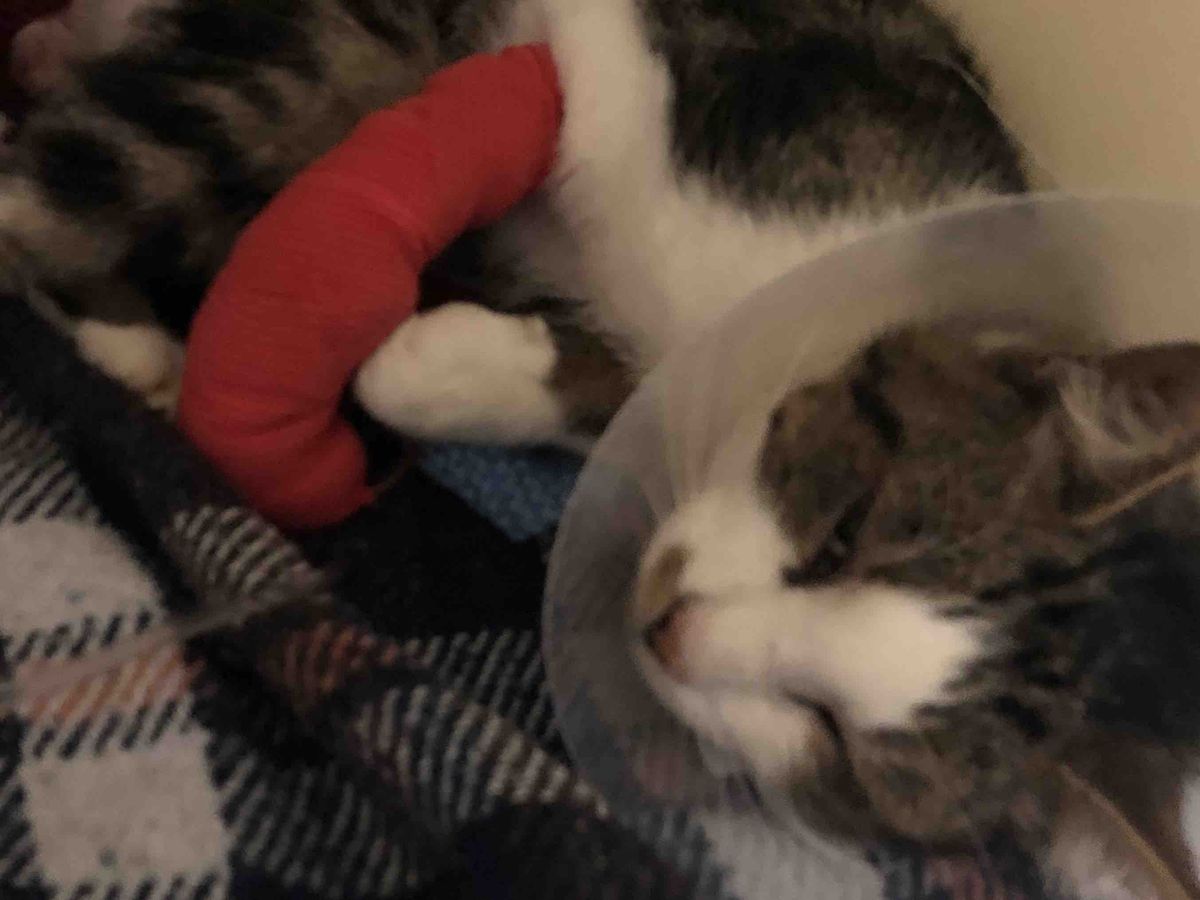Cayden was found on the 21/10/18 in a greenhouse in Bodmin, he had an horrendous injury to his tail, which we believed was caused by a vehicle running over his tail and degloving it. His injury was believed to be about 7-10 days old, he was rushed to an out of hours vet. On the 22/10/18 Clay County Cat Care took over the care of Cayden and transferred him to our vets where he was given pain killers and examined and kept in for surgery the following day. Whilst being examined by our vet, Cayden wrapped his front paws around my wrist and held me tight. I was talking to him and reassuring him that he was safe and we were there to help him. He had tears in his eyes, I’ve never in my 20 years seen a wound so severe and a cat still so loving whilst obviously in so much pain.
