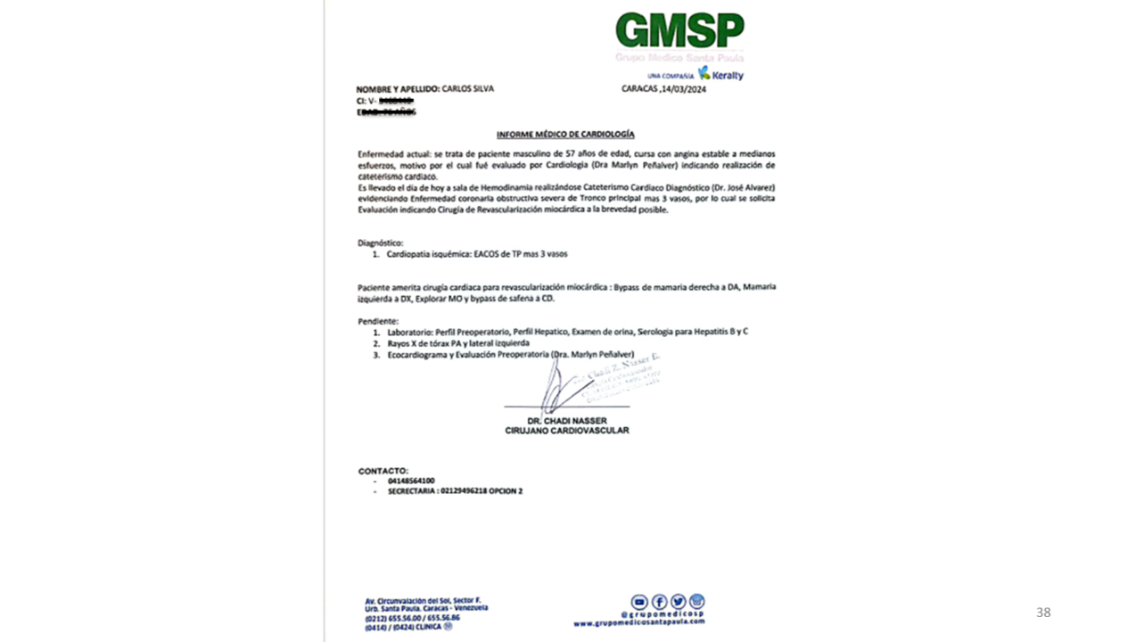 Hola, mi nombre es Javier, y me dirijo a ustedes en busca de ayuda para financiar la cirugía cardíaca de mi padre. Inicialmente, el equipo médico planeó una cateterización cardíaca y la inserción de dos stents guiados por ecografía vascular. Sin embargo, durante el procedimiento, quedó claro que la condición arterial de mi padre era mucho peor de lo anticipado. Ahora se enfrenta a una grave enfermedad arterial coronaria obstructiva en el tronco principal y tres vasos, lo que requiere una cirugía urgente de revascularización miocárdica con tres bypass. Los costos asociados con esta operación son exorbitantes.