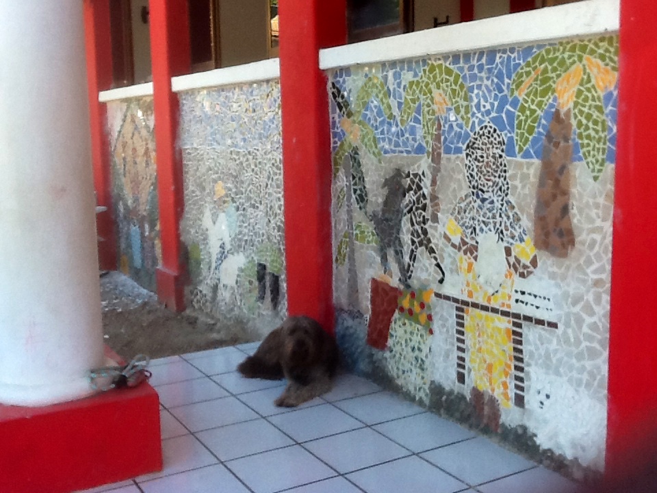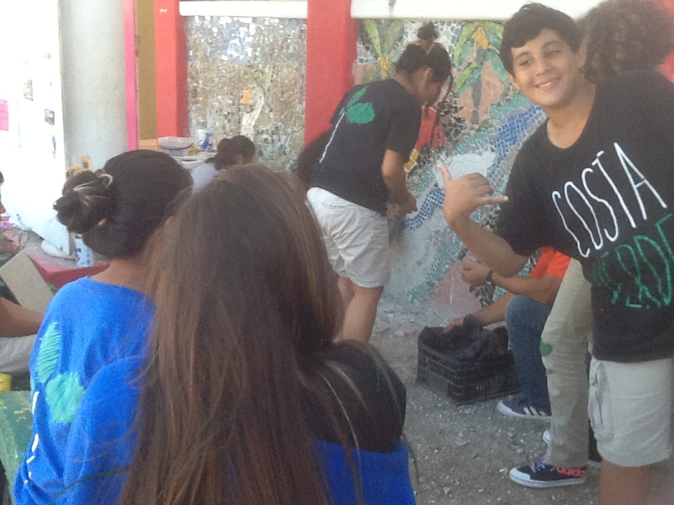 With the help of the translators,  Alejandra Montoya, and Hector Esparza, Metzger researched and met with members of the original families in the summer of 2013. She submitted for government approval pastel sketches depicting the elders' stories of coconut oil and lime harvesting along with fishing in a sea with every type of seafood imaginable.  With the approval of the Valle de Bandaras government and Sayulita's delgado (mayor), the 8 -panel facade of the Casa de la Cultura (cultural center) was prepared for a mosaic depicting the elders' stories of their lives on the hacienda as young workers.  Tiles were donated by homeowners with leftover tiles from their house constructions and stored and sorted by Costa Verde and its students who, with local and foreign volunteers, worked under Metzger's direction for four sweltering, back-breaking months.  CVIS is currently undertaking the donation and installation of a new garden in front of the wall.