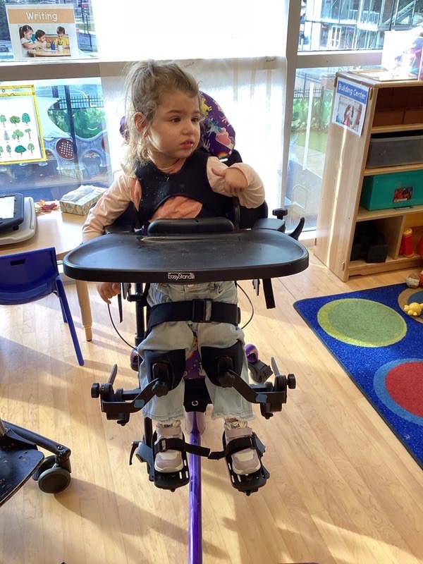 She’s currently 3.5 years old and we are still working on sitting independently. She does not reach for anything or make much eye contact. Lots to work on in PT, OT, speech, and feeding therapy.
