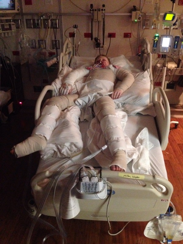 For example: (in the burn unit) As Schylar was being pushed to walk and fighting through the pain he began to cry. His mom ask what was wrong? He said,”Mom do you hear that baby crying? I just cant stand it. No baby should have to go through this much pain. Mom, I wish I could take that baby’s pain.” Mom said, “Even with all the pain you are enduring, you would take on more pain to help that baby?” and Schylar cried and said, “YES! MOM.”