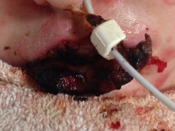 Schylar spent nine excruciating days at the University of Kentucky before being transported to Shriners Burn Center in Cincinnati, OH. It wasn't until he began vomiting blood, that they finally listened to his parents, his allergist and a pediatrician from John Hopkins University that he needed more specialized care. Thankfully, he had these instrumental physicians in his corner. When he arrived in the burn unit things began happen very quickly and it was immediately clear he was exactly where he should have been in the first place. At 2 a.m in the morning a team was awaiting his arrival and began to work on him for the next 4 1/2 hours. Later the same day they sedated him and inserted a feeding tube that extended into his small intestines, an IV to prevent dehydration and administer pain meds and a foley cather, as his urinary tract was also affected. Schylar has been in Shriners for 12 days, as of today. Until the last 48 hours Schylar’s eyes have been shut, as the discharge, swelling, and sloughing of skin, sensitivity to light and pain would keep them sealed shut.