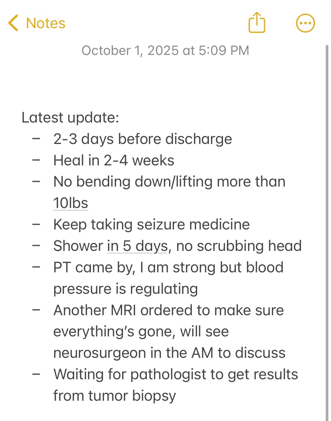 Today is Tuesday, September 30, 2025. I had a craniotomy surgery today. They removed the benign tumor and the ‘tentacles’ that extend from the tumor. I will be out recovering for 4 weeks, which means I will not be able to return to work for 4 weeks at the minimum. God has guided such caring individuals to surround me, but burdening my family and friends by asking for money is taking a toll on my mental state. I am unaware of what my medical bills will be. Any extra money I do not use, I am donating to another brain surgery patient in need.