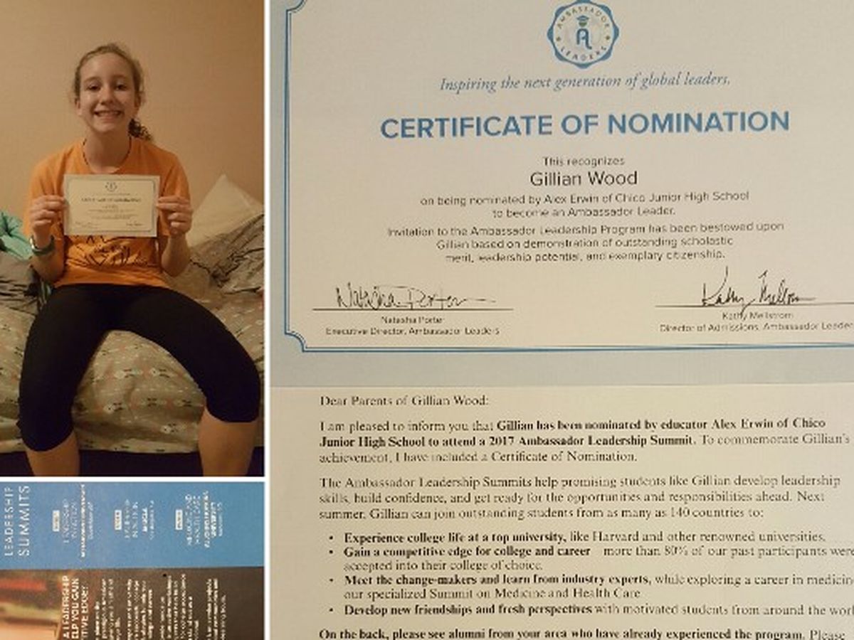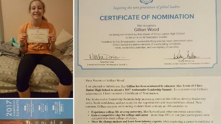 My name is Gillian Wood and I am 13 years old. I attend Chico Junior High School. I was nominated for the 2017 Ambassador Leadership Summit by my STEM teacher Mr. Alex Erwin. This program will help me develop leadership skills, build confidence and prepare me for the opportunities and responsibilities ahead. I would have the opportunity to join other outstanding students from 140 countries to: Experience college life at a top university, like UCLA or Harvard, gain a competitive edge for college, 80% of attendees are accepted into their college of choice, I will learn how to make a difference in my community and earn 20 service learning hours.