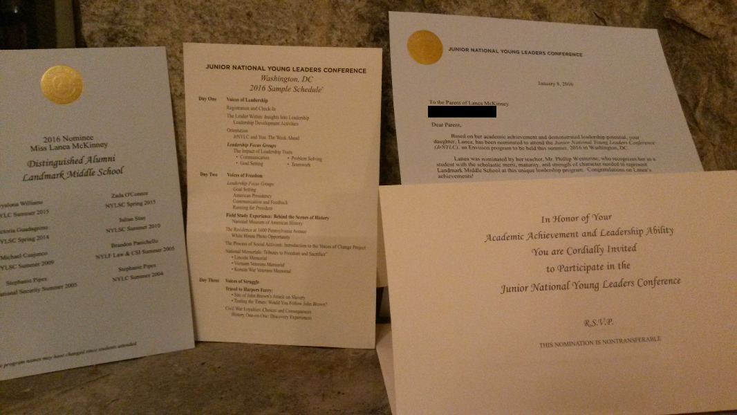 My amazing daughter, Laney, an 8th grader at Landmark Middle School, just found out she is invited to attend the Spring 2016 National Youth Leadership Forum: National Security - Diplomacy, Intelligence & Defense. This is an amazing opportunity that will allow her to spend 6 days in Washington, DC, meeting one-on-one with representatives from all branches of the military, federal agencies, and private companies to learn about education and career opportunities, visiting government agencies, foreign embassies, and military facilities such the Pentagon, Quantico, and U.S. Department of State, and learning about our nation's leaders while expanding on her own leadership abilities. She will attend leadership focus groups, visit the White House, the Lincoln Memorial, and explore careers in national defense and intelligence. Also, she gets a college credit for attending!