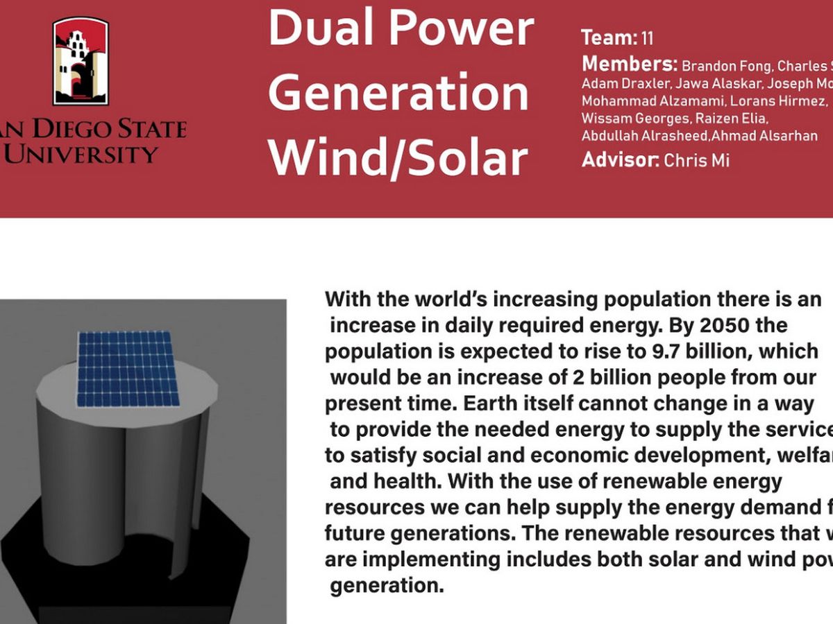 Our Electrical Engineering Senior Design group is asking for financial support to help us build a prototype of a Dual Power Generation that implements a Vertical Wind Axis Turbine and Solar Panels. We chose to pursue this project because our goal is to be part of the renewable energy movement and provide a reliable energy source to third world countries that lack the resources. Though our main objective is to help third world countries, it is also a goal of ours to help the people of our great nation, USA , to have an ample amount of supply of energy for future generations. With the Dual Power Generation, the system will harvest wind and solar energy, in the form of AC and DC, respectively. With the use of power electronics it would be converted to levels that can be used by consumers in either DC or AC. For instance, the rotor blades will capture the wind and convert kinetic energy into the hub. This will capture an AC signal. The hub is where the rotor is housed and is where kinetic energy is converted into mechanical power. Then finally the conversion of mechanical energy to electrical energy is done with the use of a generator. Our prototype will be approximately 6ft. tall, with 4 blades that will be approximately 3ft from the center of the rotor. The foundation will be our base and house the gearbox, battery, and the micro-controllers. Two micro-controllers will be used in multiple areas of the project. One, is to control the maneuvering system so that the solar panels will be in the optimal position to harvest the most solar energy. Secondly, it will assist with the Maximum Power Tracker, which will give us the ability to track and control the levels of the Dual Power Generation system. Our goal with the prototype is to be able to charge up a battery then maybe a laptop or some kind of electronic device. We will work through our progressions with the type of loads we want to power up but it is our ultimate goal to power up a household for a day which would need approximately 28.9kWh.