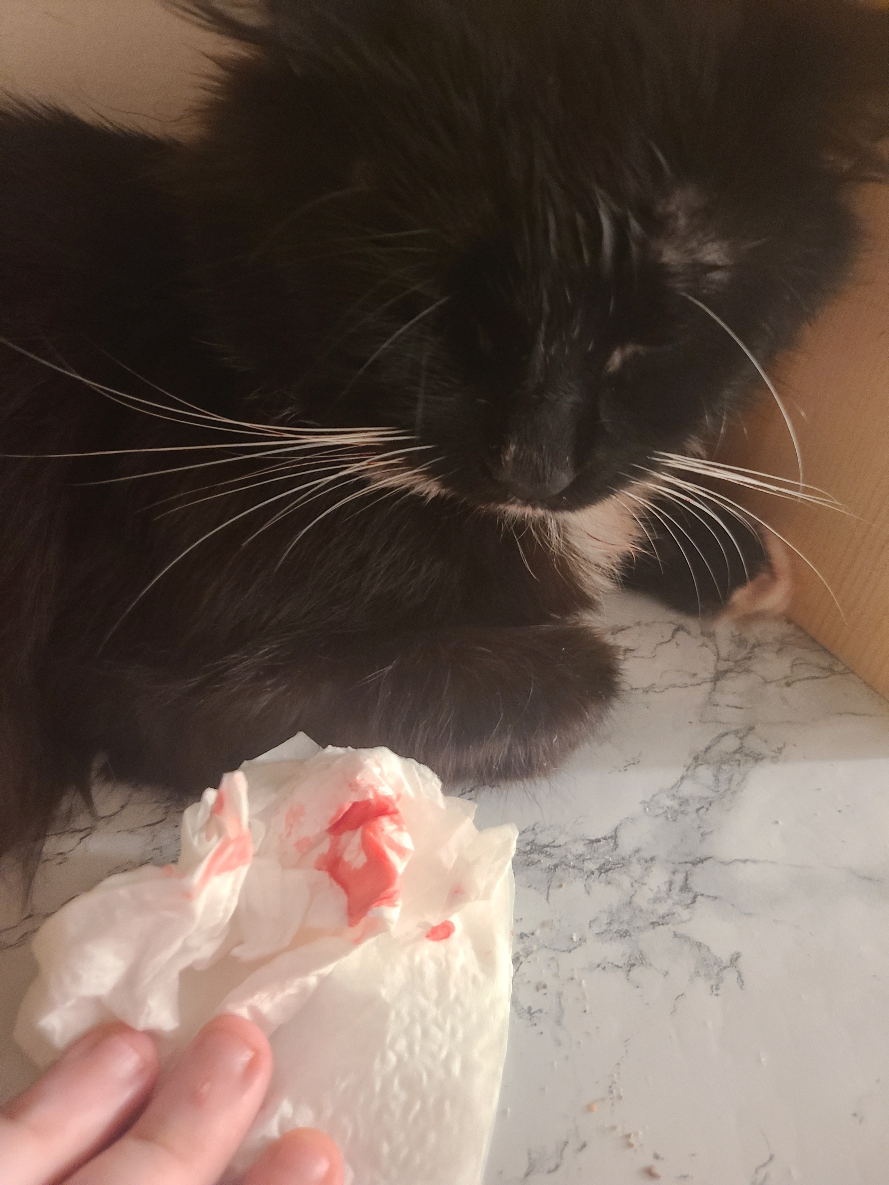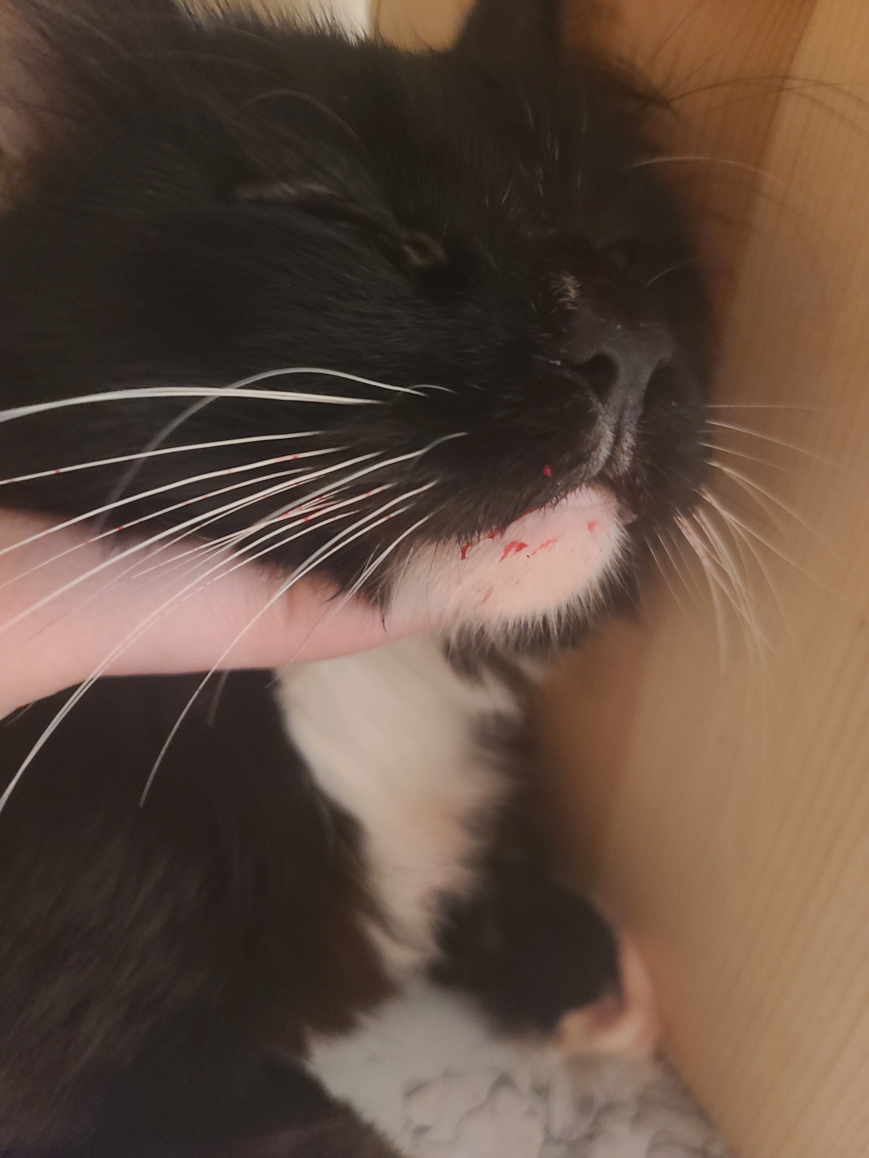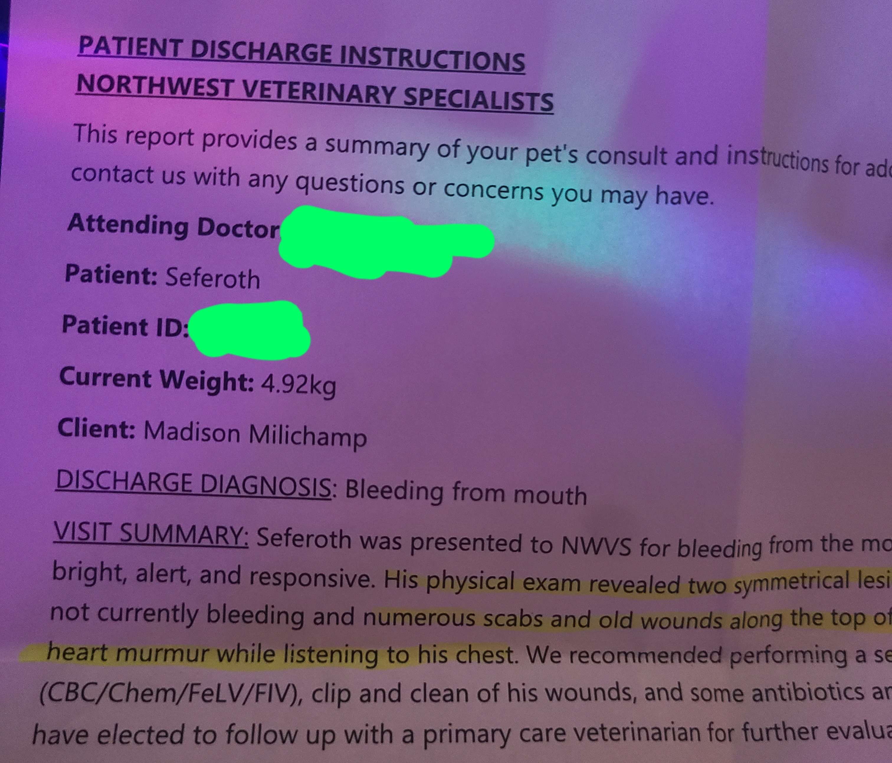 This is my cat Sephiroth (which the vets hilariously misspelled Seferoth, haha) -- we took him to the emergency care for excessive bleeding from his mouth. The vet cleared him to go home as they could not find any external injuries that caused the bleeding, but it has not stopped.