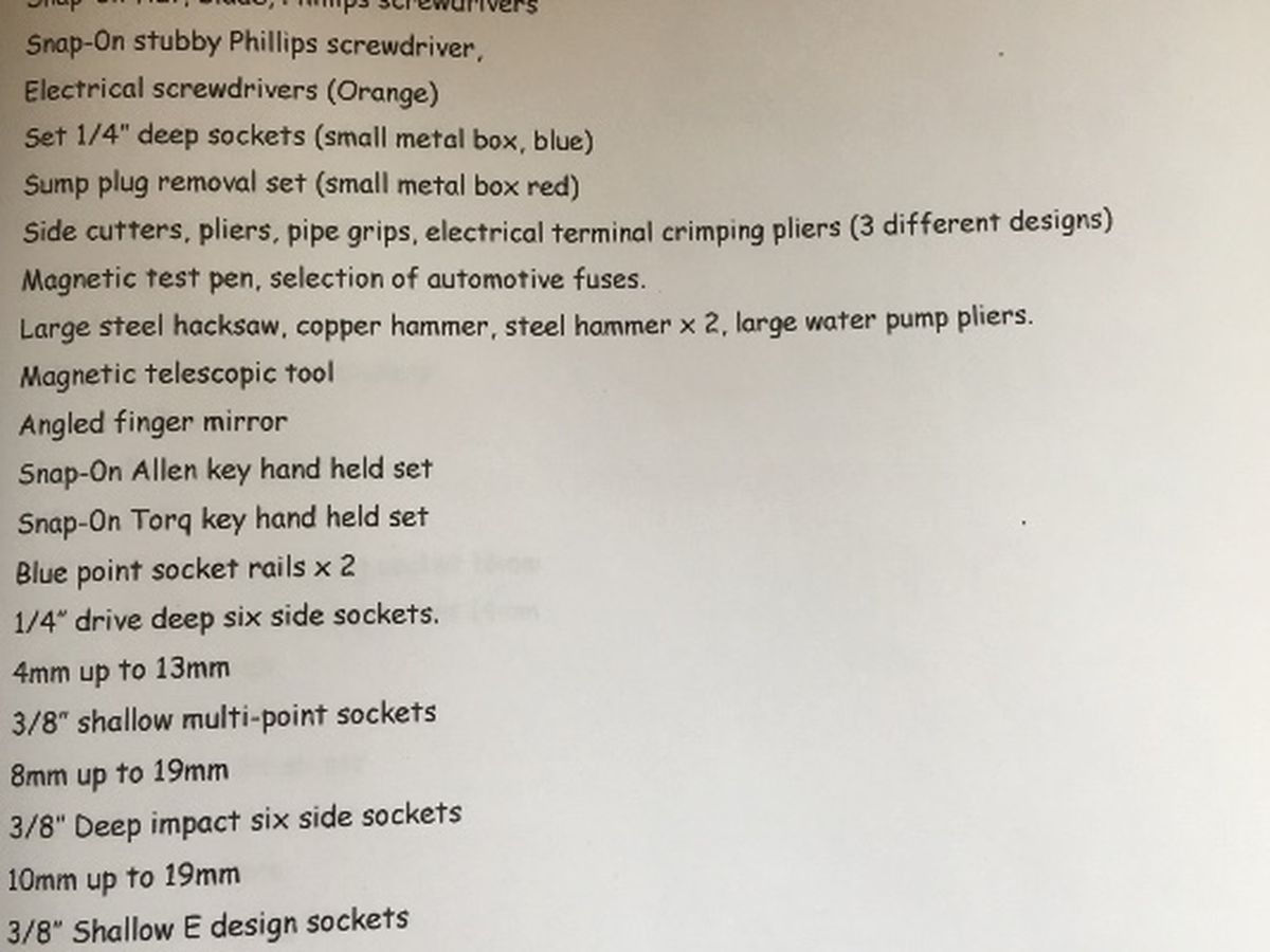 I'm making an appeal on for my gorgeous man Shaun Stonier and our Peak Tec business. I saw him utterly broken last night! He was left completely devastated after his van was broken into outside our house. He has spent all of his career buying and collecting tools for his trade to enable him to be a mobile mechanic and available for customers anywhere. He works with trucks, cars, vans and construction machinery so his tools are many and incredibly varied. In the space of us going to bed at 2200 and the police knocking on our door at 2240 his van door with its high end security locks had been wrenched and bent open and the contents loaded into a waiting car. As the van is rarely ever at home it is doubly unbelievable that this has happened. Luckily a neighbour heard the car and reported it to the police, they arrived within 5 minutes but it was too late. I'm compiling a list for the police but at the moment the estimated value is approx £8-£10,000! If you hear of any Milwaukee, Snap-on and Facom tools being sold anywhere please let us know. The second part of my appeal is to ask if you kind hearted people out there to help me replace his tool collection. I've posted a picture of just one page of items..the list covers three pages. We need sockets, ratchets, impact driver, electrical screwdrivers, electrical testing kit, wire crimpers and pliers + lots more. Anything to do with mechanical tools will help! Shaun has worked so hard trying to build up his business, working long hours, weekends and evenings to make an honest and hard earned living. He's such a great person...he will help anyone, he's so lovely to everyone and makes no demands back. He is a rare man in being a very honest mechanic. He often doesn't charge what he should, he delivers and fetches customers cars at no extra charge and he will not carry out unnecessary work even if it means he makes no money on a job. He took on a workshop just over a year ago, bought a small truck for recovery and transport, he also has tried to earn a little extra by opening a car wash which employs my daughter and granddaughter...anything to help out the family! With the addded costs of rental on the workshop, another vehicle and motor trade insurance he decided not to separately insure the contents of the van. As the van is almost 99 times out of 100 at the workshop it didn't seem to be a problem. But, as he was due to go mobile to a customer at 6 am the van was bought home. The rest is history. He has now lost his only means of making an honest living. I would dearly like to help him somehow and this is the only way I know how. I want to bring him back from the broken man I have witnessed. Please help.