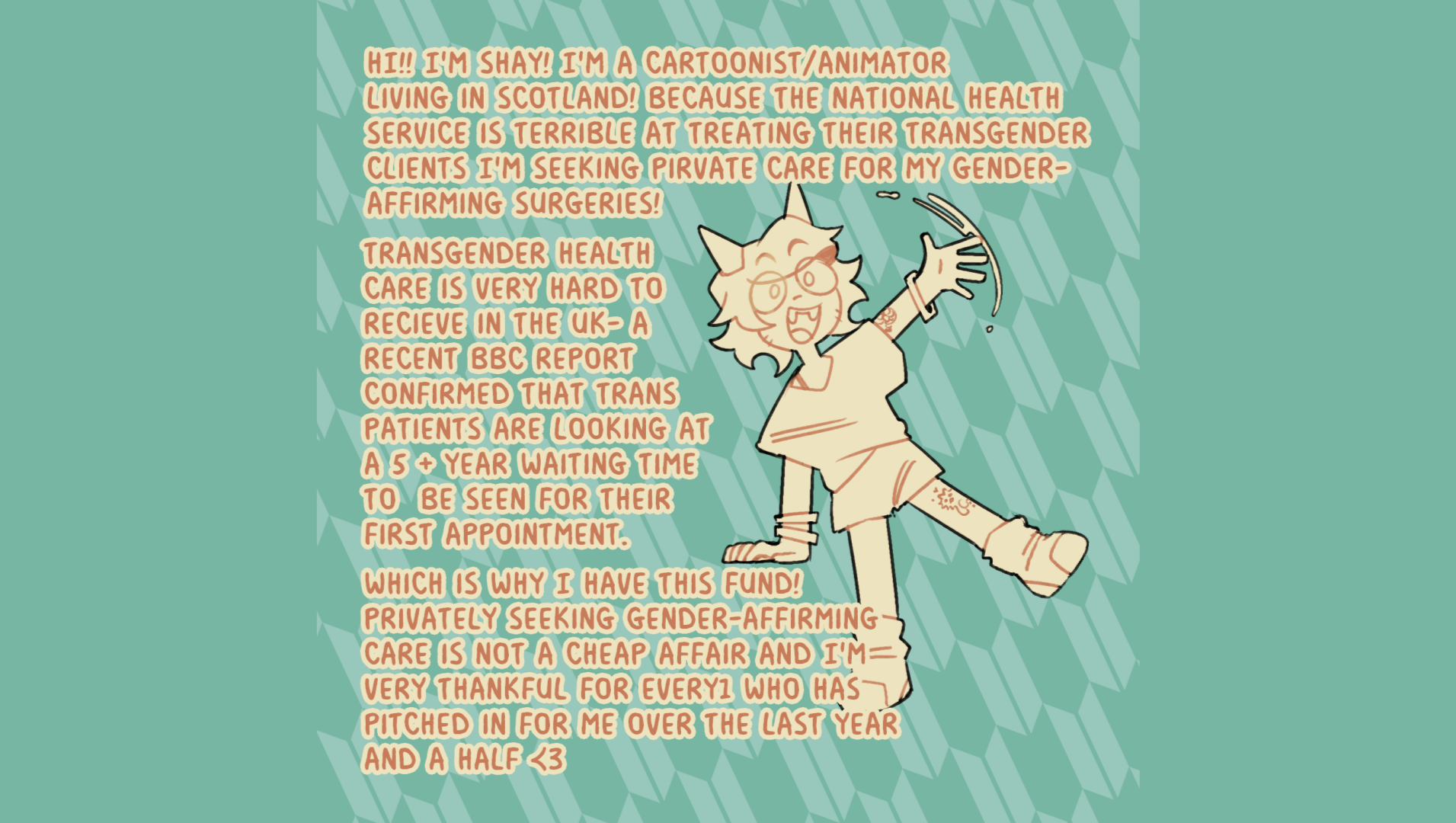 HI! I'm Shay! I'm a cartoonist/animator living in Scotland! Because the National Healthcare Service is terrible at treating their transgender patients I'm seeking private healthcare for my gender affirming surgeries!
