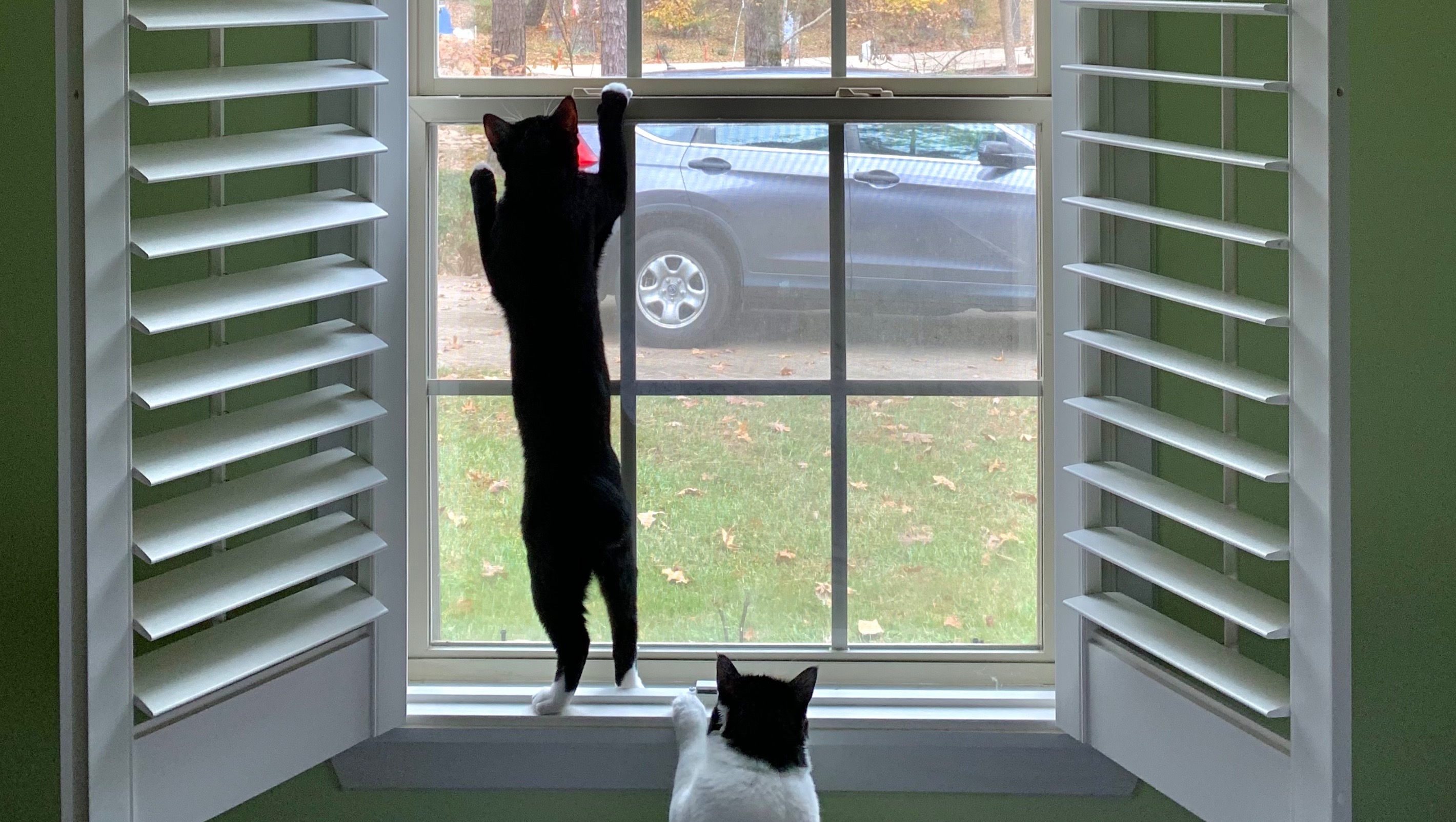 Since adopting Sheva, life has taken on the color of play. He loves to climb windows, jump, wrestle with his sister, chase his laser toy, and stretch his body very long. I’m used to a kitty who is in play mode most hours of his day. Sheva has always been a very mobile boy.