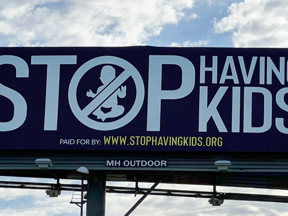 Stop Having Kids was granted a very generous donation in 2021 that enabled our first significant advertising campaign, which was 3 billboards in Portland, OR that said "STOP HAVING KIDS" and 1 billboard in Salem, OR on the highway that said "A LOT OF HUMANS WISH THEY WERE NEVER BORN."
