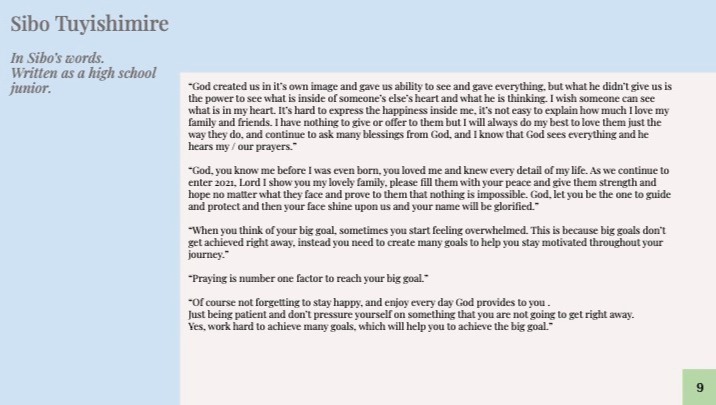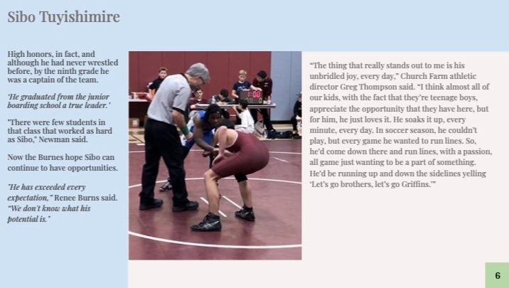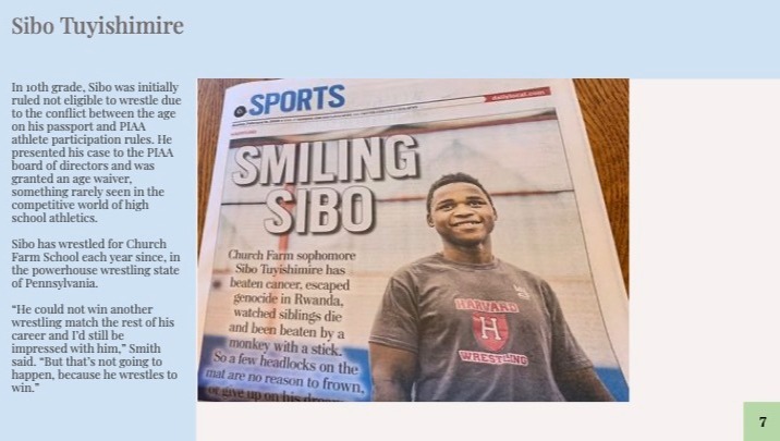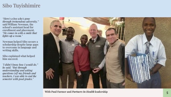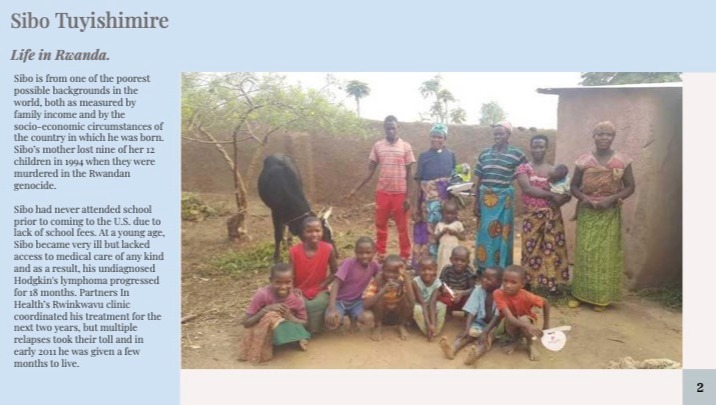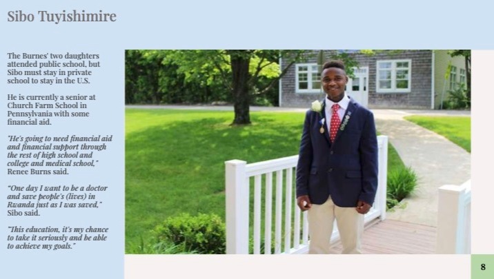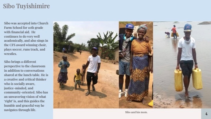 Sibo first came to the U.S. as a sick child who required intensive medical treatment. It was impossible not to fall in love with Sibo. He dreamt of getting better, going to school in the U.S. and being able to give back to a community that gave him so much. Five years later Sibo is still cancer free and has consistently received high grades at an elite school back in Rwanda. Making his dream a reality, Sibo attended the amazing Church Hill Farm High School as the first step in this journey. Sibo has set his sights high for college and needs financial support to allow him to continue to excel.
