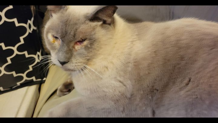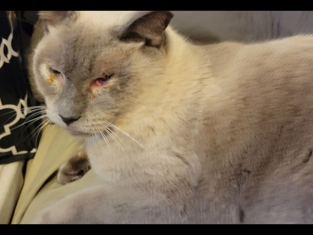 Simon is a community cat who my mom and I have watched over for the past 15 plus years. We wanted to bring him into our home years ago – we are indoor cat people – but he was not receptive to the idea. A few weeks ago, he didn’t come for breakfast one morning. This has never happened before, and I thought the worst. He was gone for a few days. My mom went searching around the neighborhood and found him. He was severely congested, and his eyes were swollen and crusted. I brought him to the vet, and he was given an antibiotic and prescribed eye drops. They initially helped. However, a few weeks later, his eye condition returned. They were crusted, and he started scratching and rubbing them. His eyes were leaking and there was some blood. I took him back to my vet, who recommended that I see an eye specialist. They quickly got me an emergency appointment, and he is scheduled for eye surgery this Monday. He has a corneal rupture and is getting a corneal graft, which will help expedite his healing (rather than taking the chance of letting his eye heal on its own and potentially rupture further).