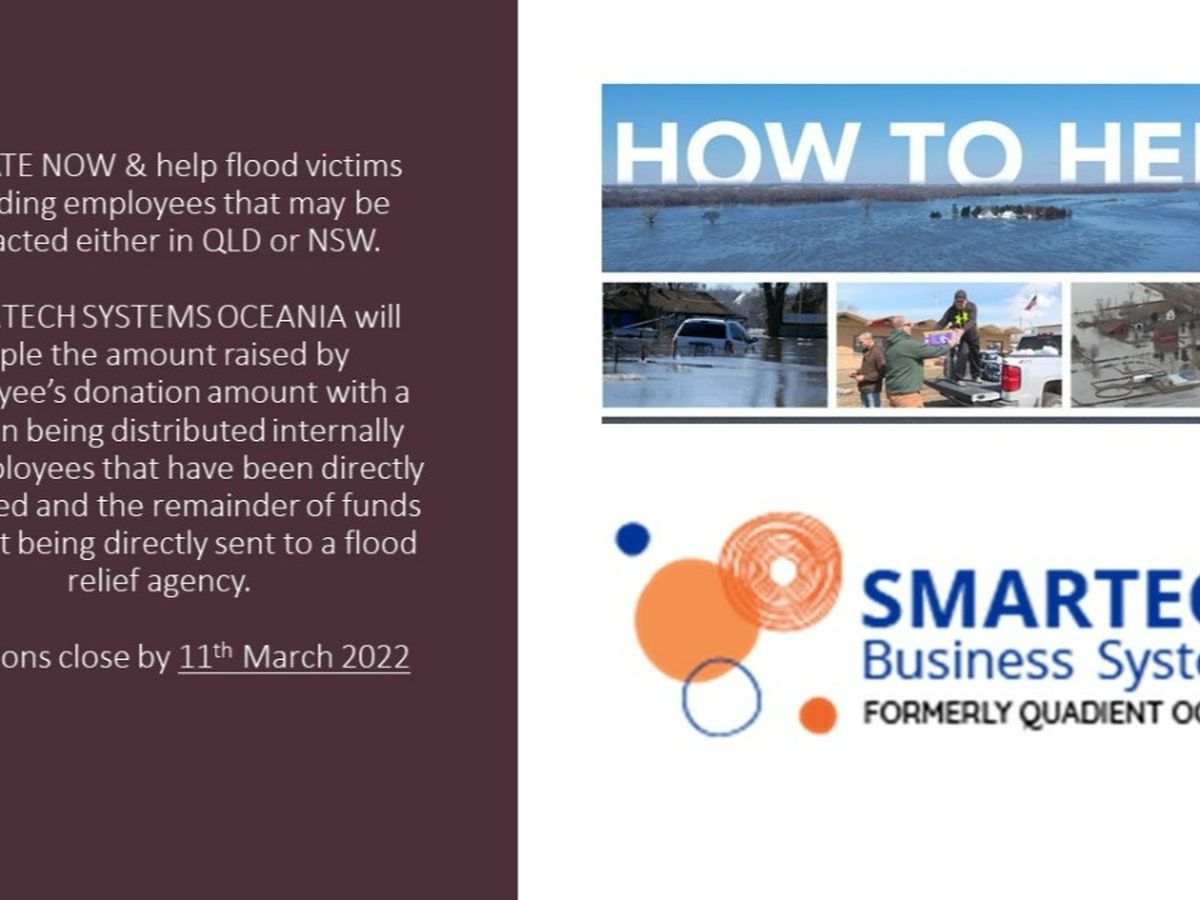SMARTECH SYSTEMS OCEANIA will triple the amount raised by employee’s donation amount. A portion is distributed internally for employees that have been directly impacted, and the remainder of the funds are directly sent to a flood relief agency.