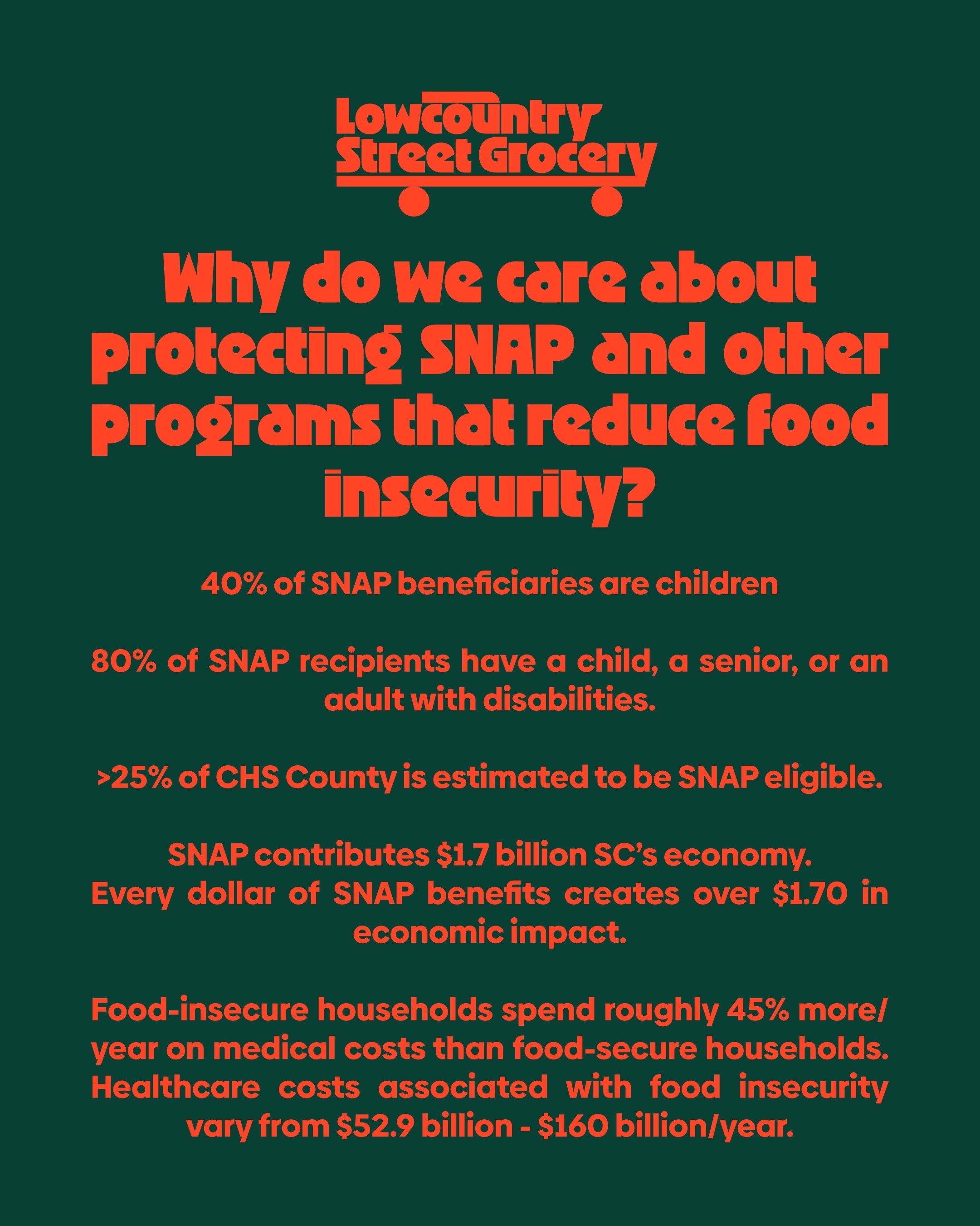SNAP/EBT and Healthy Bucks are CRITICAL. Let me say that again. SNAP/EBT and Healthy Bucks are CRITICAL. Keeping these vital lifelines open for many of the South Carolinians we serve is crucial for a healthy and viable local food system. For families. For farmers. For businesses. For healthcare costs. For state and local economies. Not just now. But later. For our kids. For our kid's kids and their kids. That's how many generations have been aided by United States SNAP programming since 1939. Pulling the rug out on such a critical component of our food system makes Produce to the People significantly harder, at a time when our mission bandwidth is maxed out.