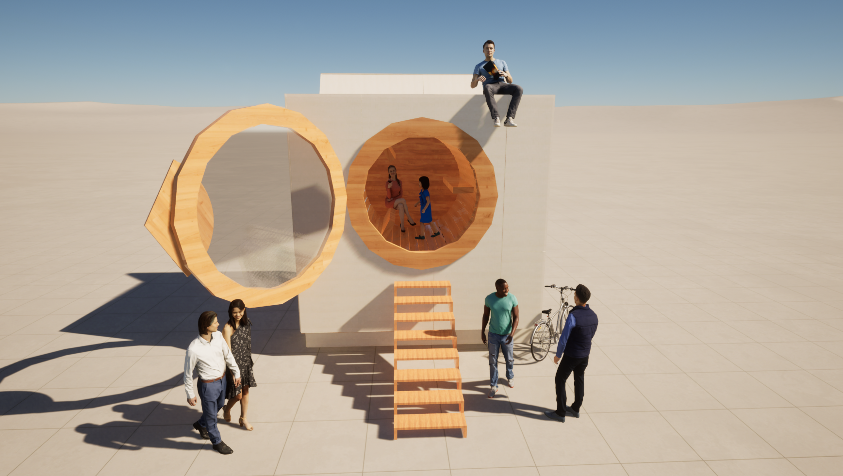 The Sock-o-tron 4200 is a life size dryer! Once inside, Guests can rotate the drum as they walk, simulating a human hamster wheel. The drum is connected to a pulley system that transfers energy to a series of fans that blow air back towards the guests creating an immersive "drying" effect.