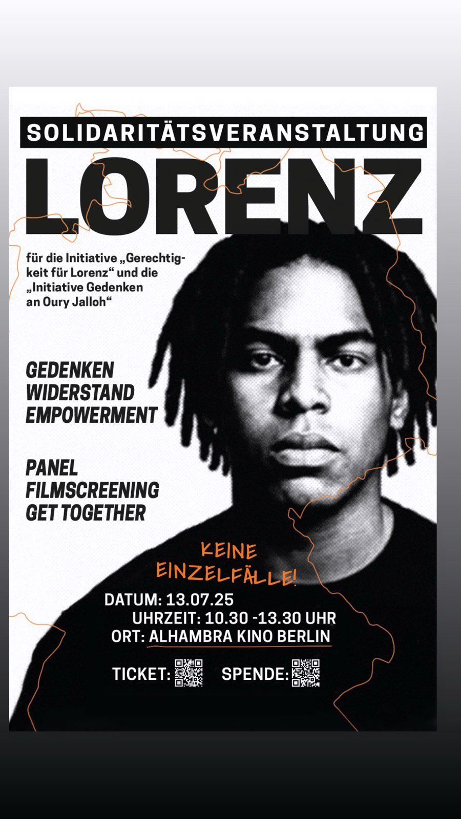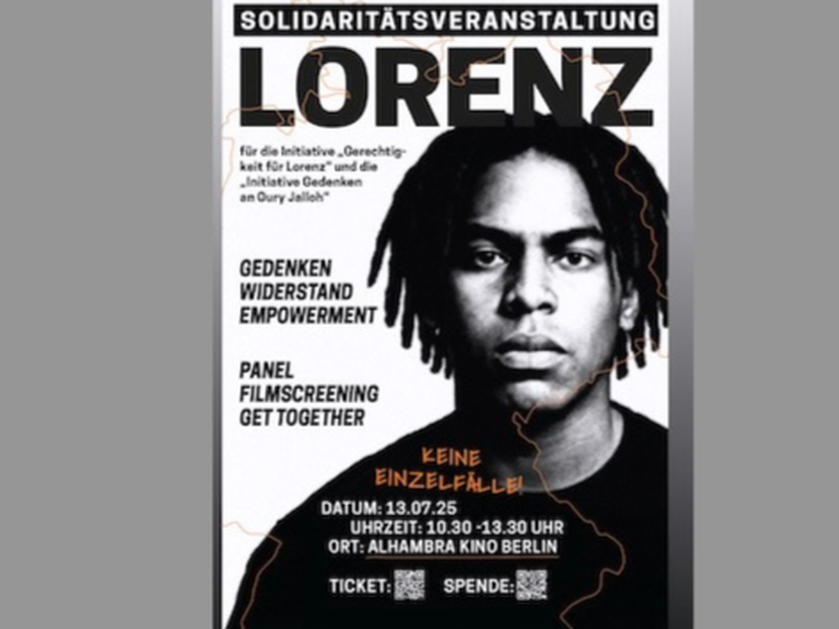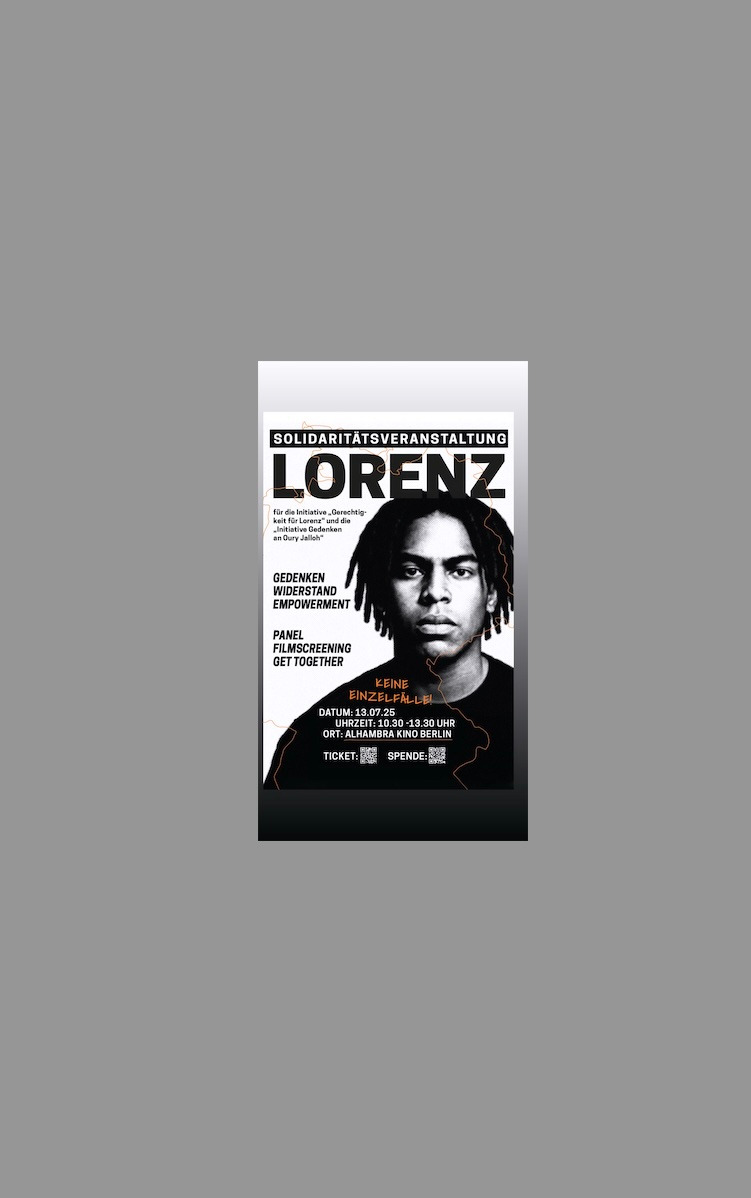 Die Filmproduktionsfirma Label Noir hostet deshalb eine Solidaritätsveranstaltung, in Kooperation mit der Initiative „Gerechtigkeit für Lorenz“, der Initiative Schwarze Menschen in Deutschland (ISD Bund e.V.) und dem Alhambra Kino Berlin.