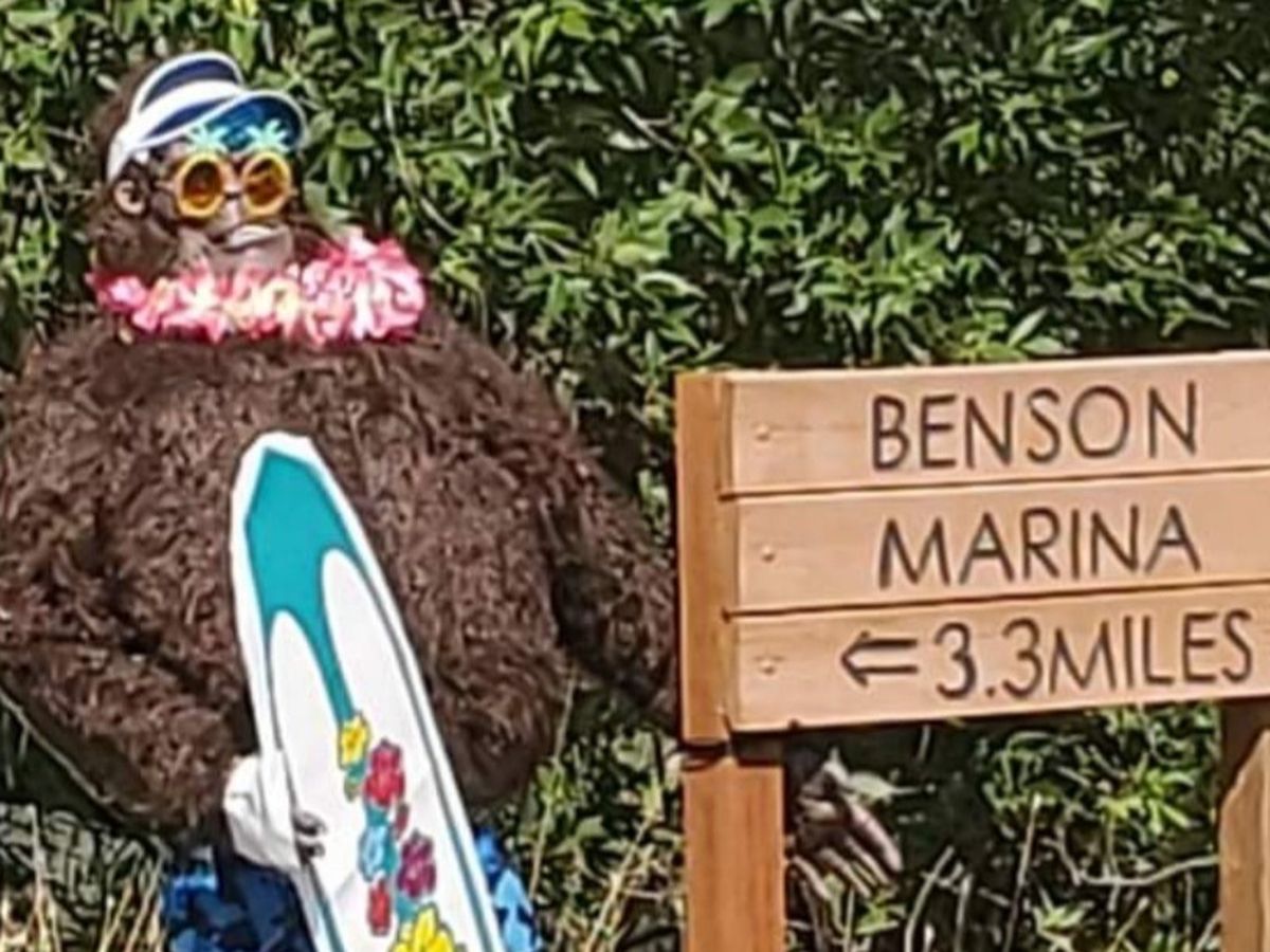 Hi Benson Neighbors and friends who travel through our awesome community. Over the past year (and more) we've all been subjected to too many negatives in life. Global pandemic.... Political mayhem..... Out of control gas prices and inflation! Then one day in the recent past, a little ray of sunshine named Sasquatch, entered our lives. Squatch has welcomed visitors to Benson with a smile and a wave. He's shown his patriotic spirit by waving flags on holidays. He has lurked in the river bottoms waiting to greet unknowing fishermen. He may have even been hanging out by the local church, waiting for an invite to come inside. No matter what Squatch is doing, or where we see him, he always brings a smile and a laugh.